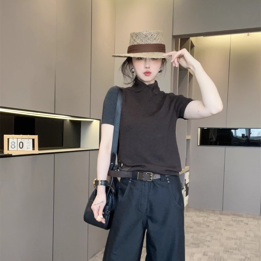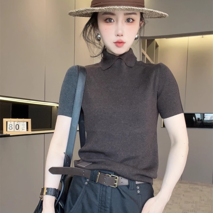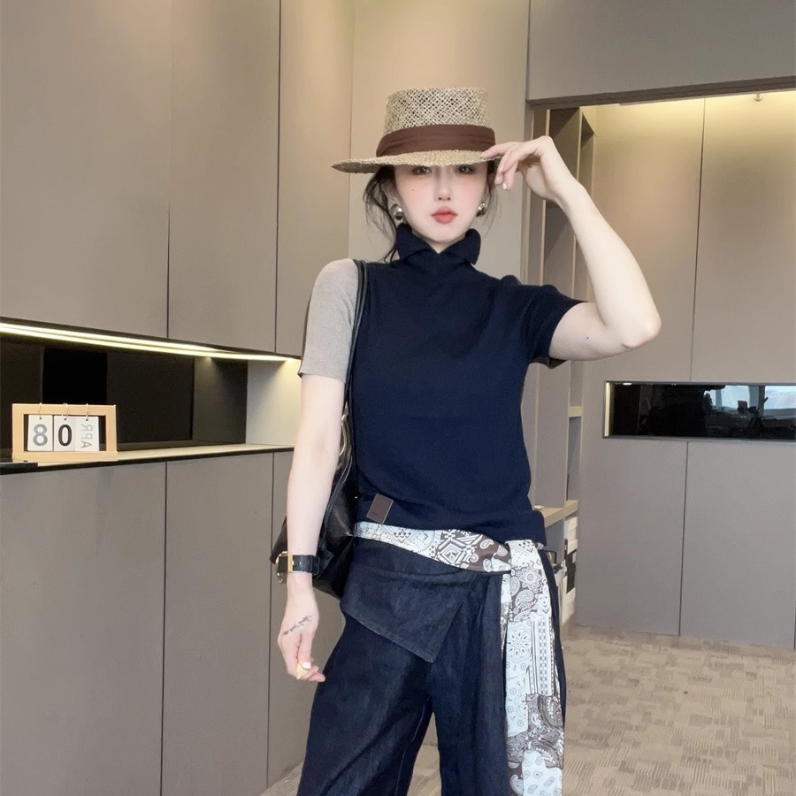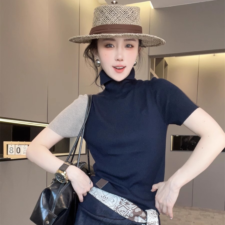 拼色针织短袖毛衣女2025新款秋季开叉高领套头半袖小衫欧货上衣潮