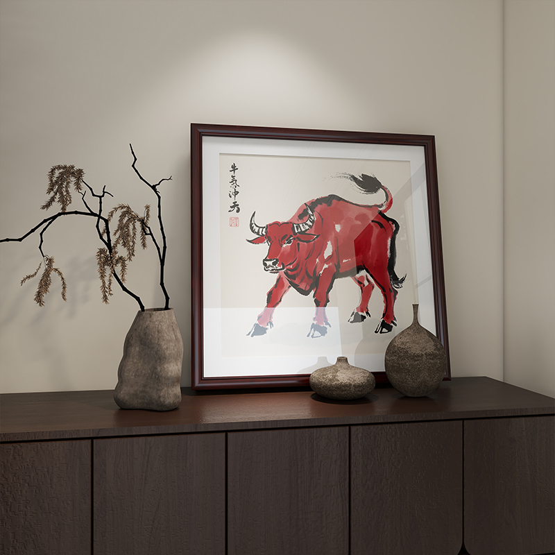 牛气冲天鸿运当头生肖红色牛装饰画办公室玄关挂画股票好运壁画