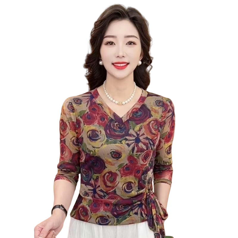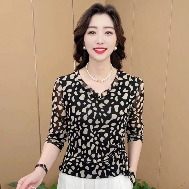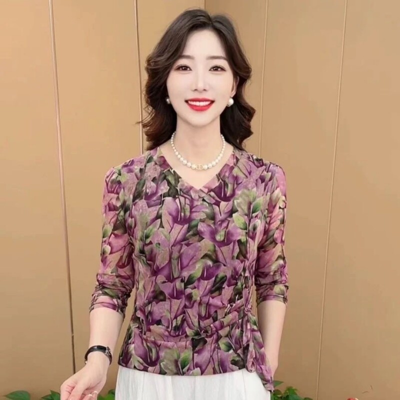 秋季大码女装新款时尚V领长袖妈妈装休闲气质百搭打底衫印花上衣