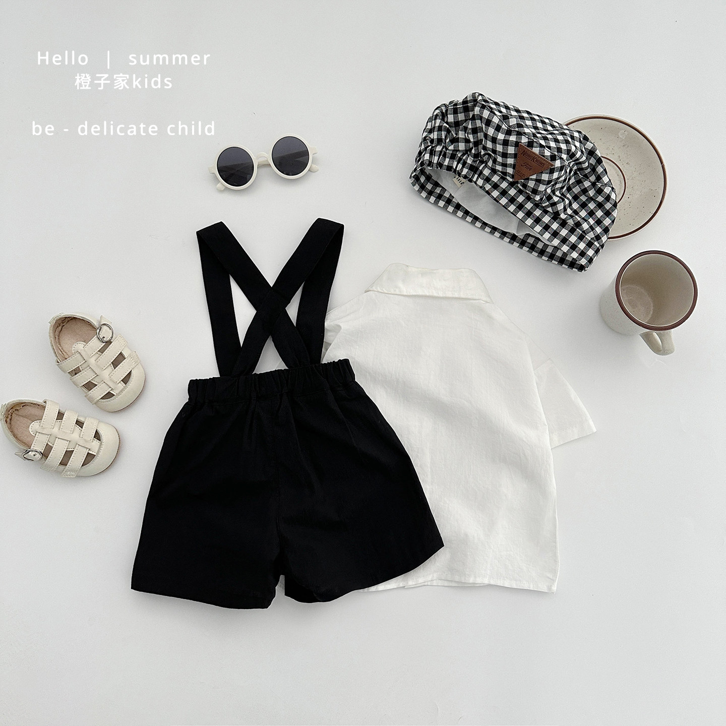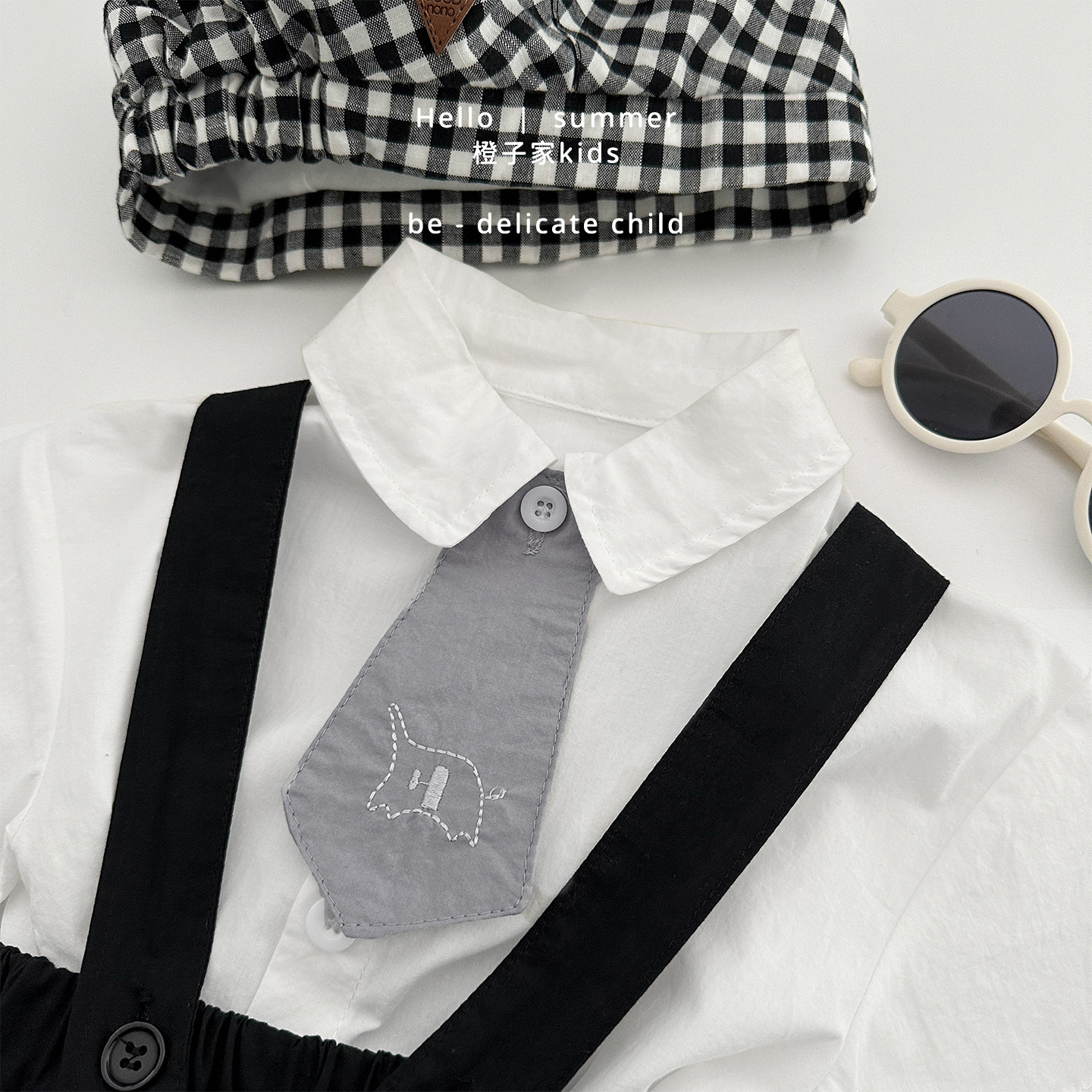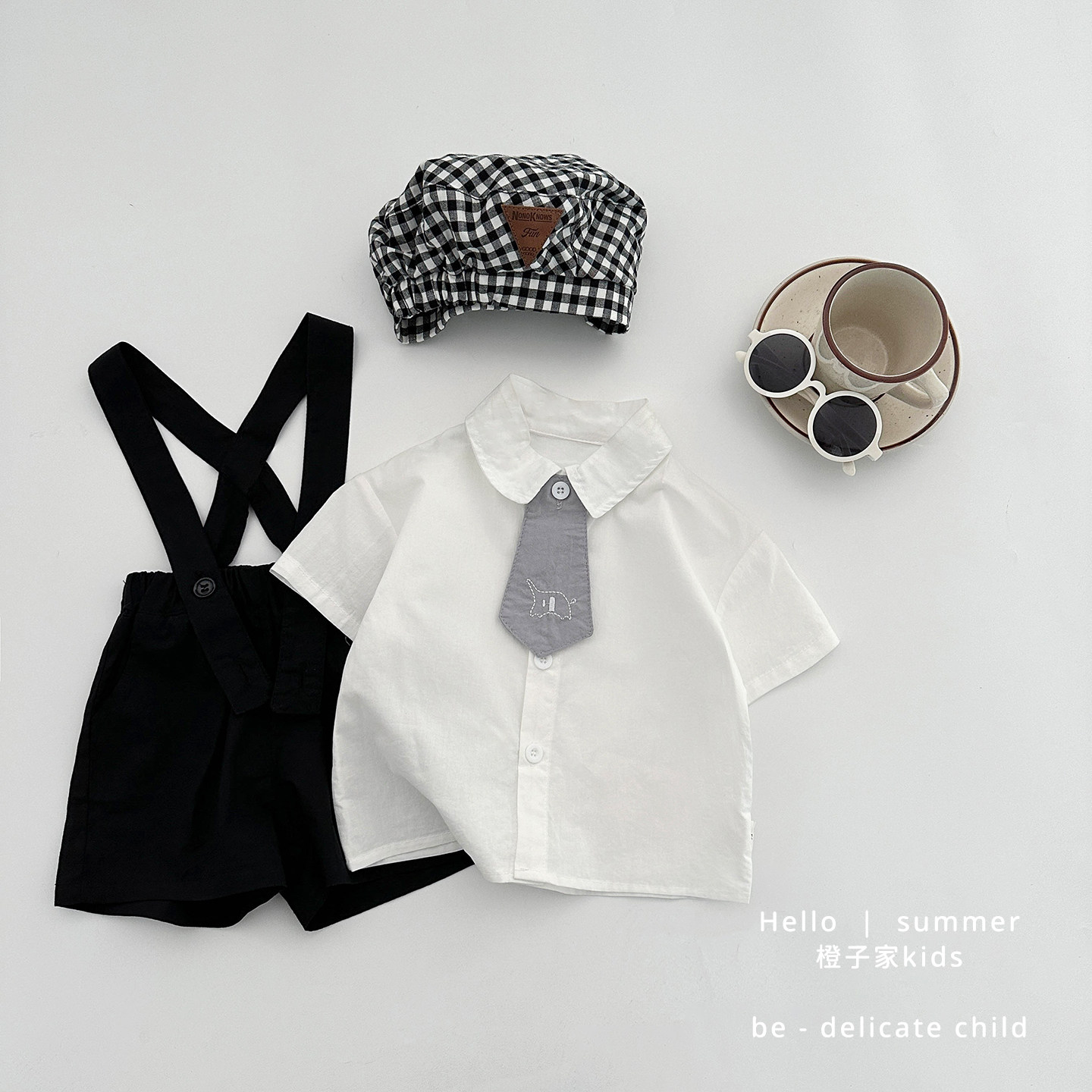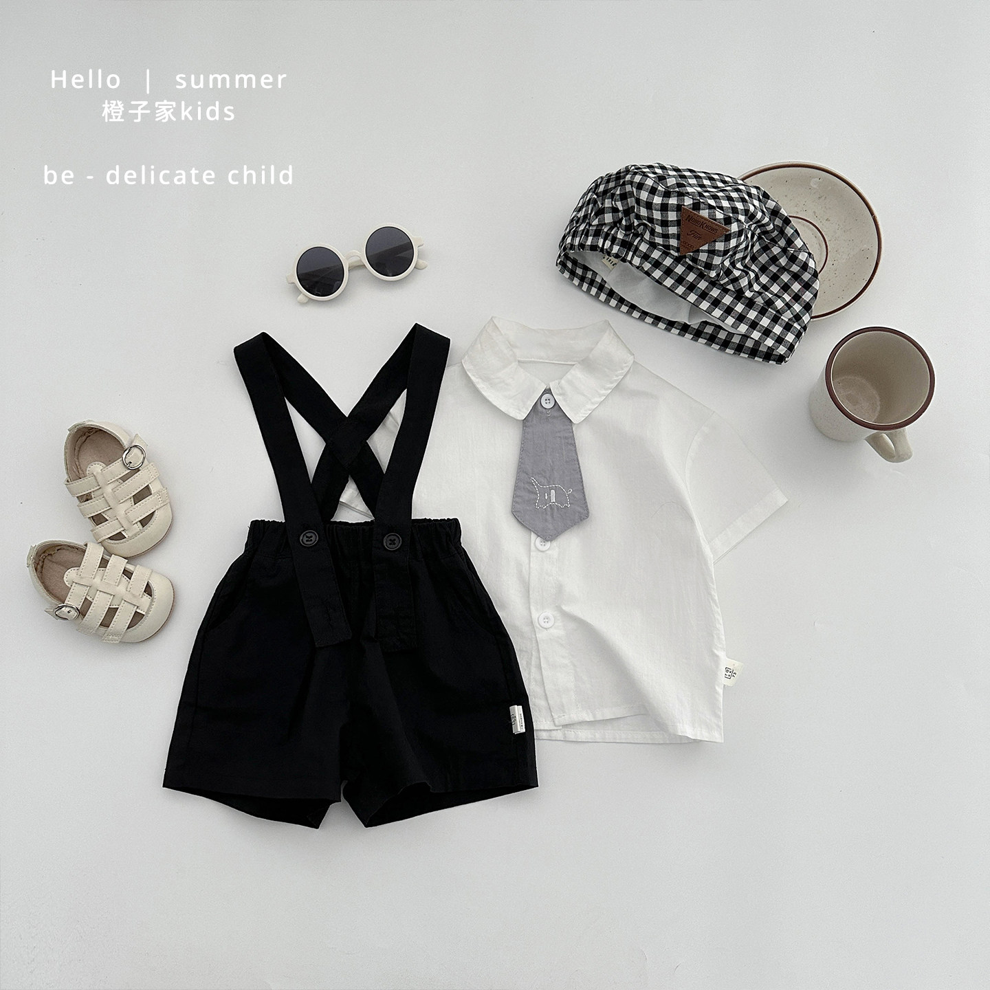男童夏季套装2025新款宝宝学院风短袖背带短裤婴儿周岁礼服薄衣服