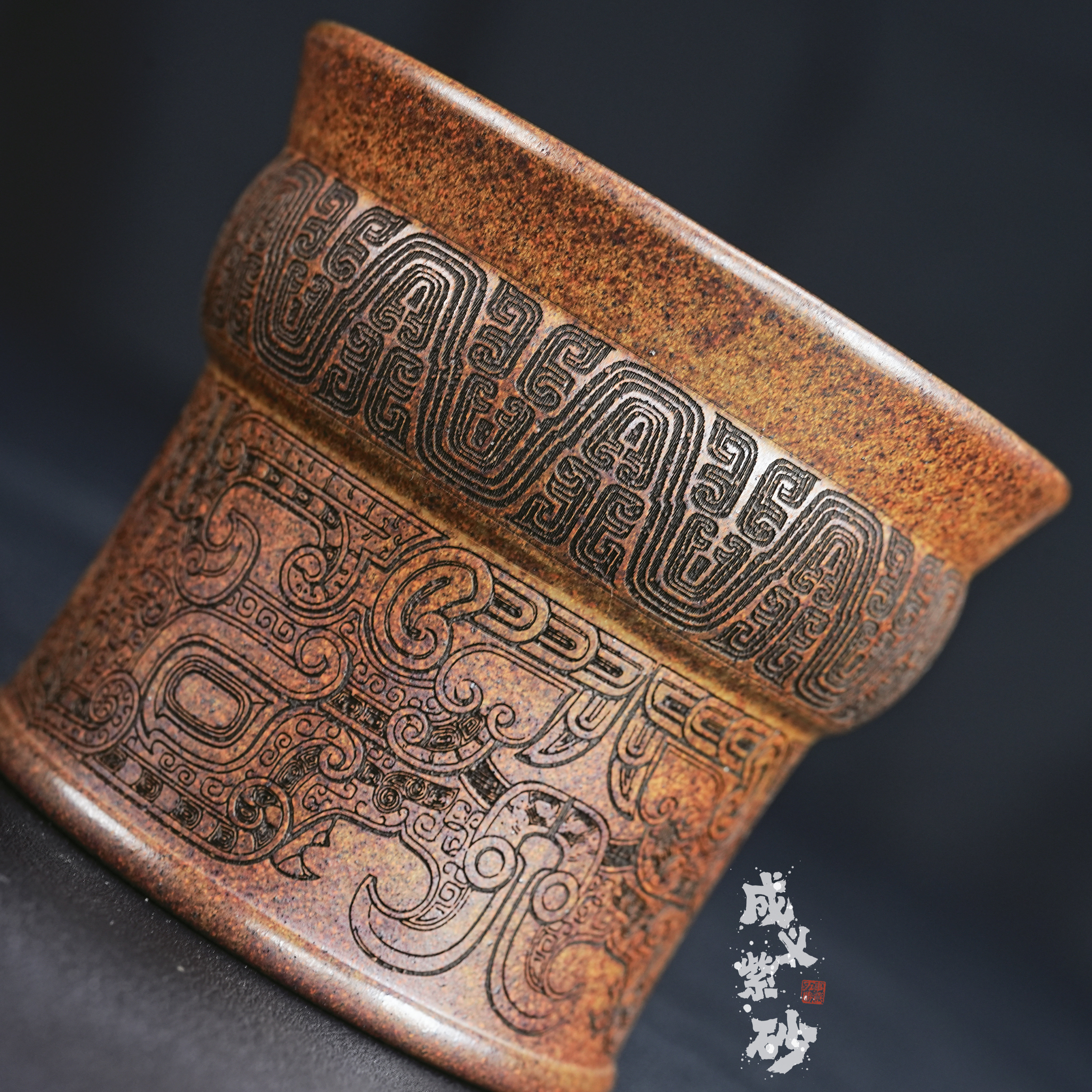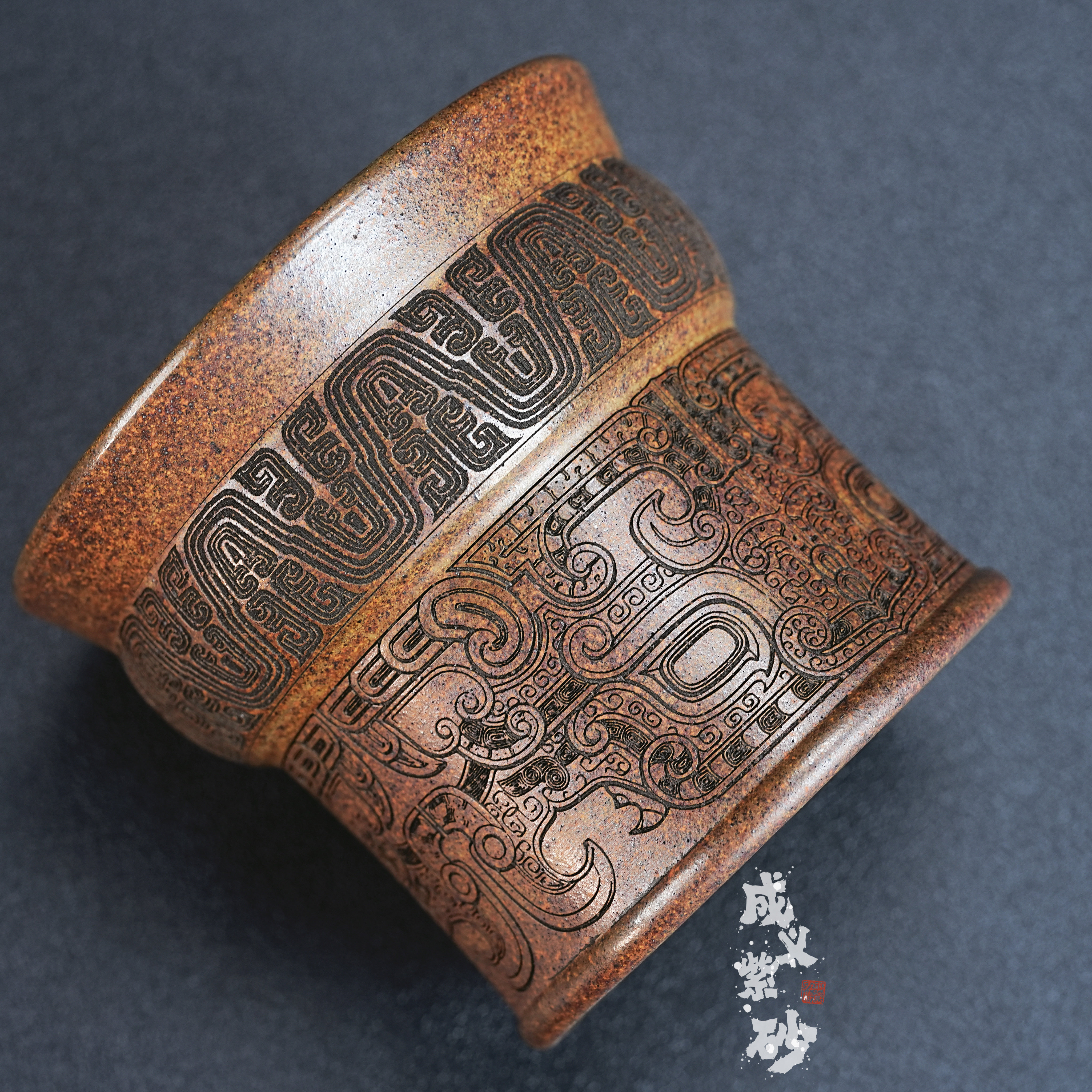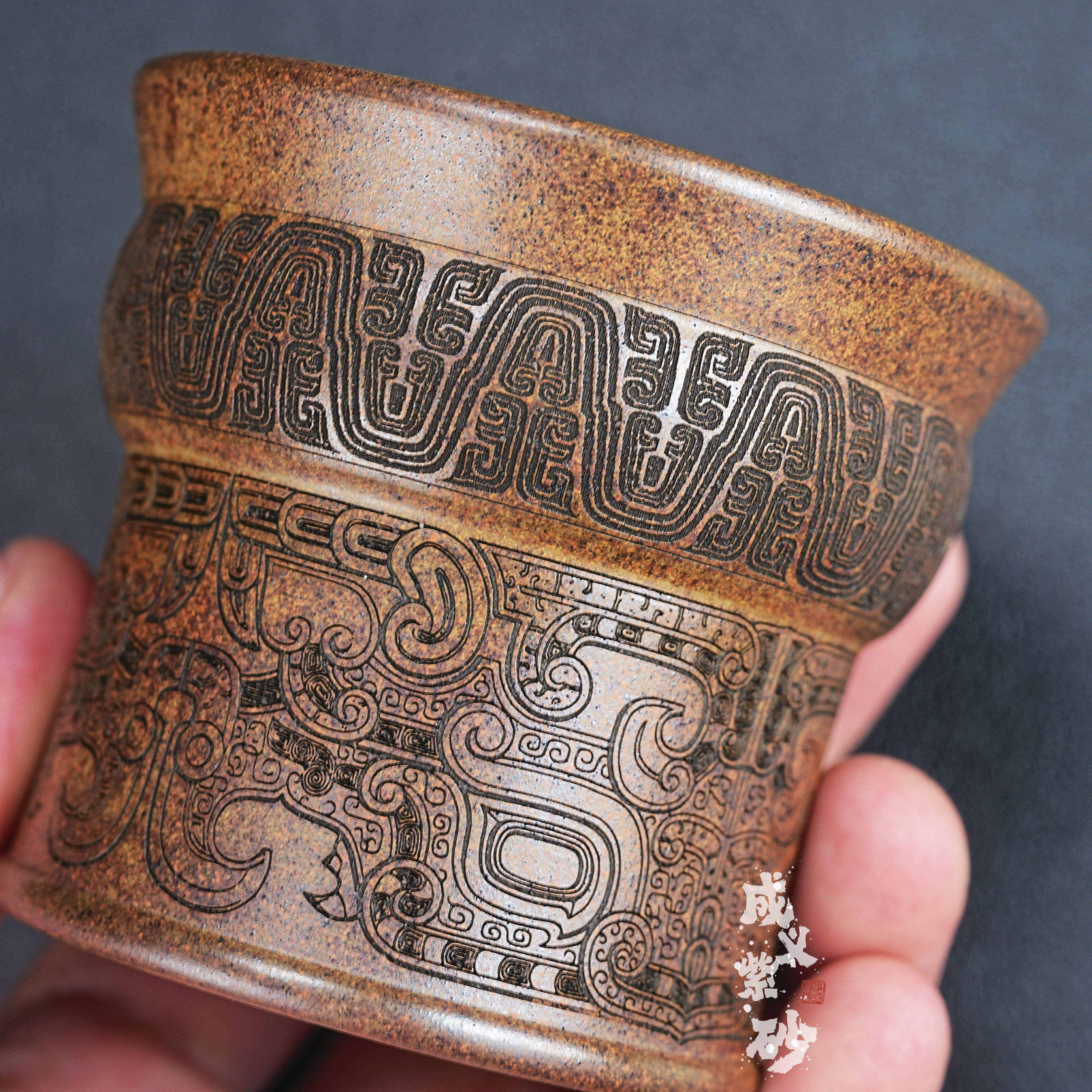 【成义】宜兴正宗原矿龙骨金砂柴烧战国风紫砂杯刻绘青铜纹品茗杯
