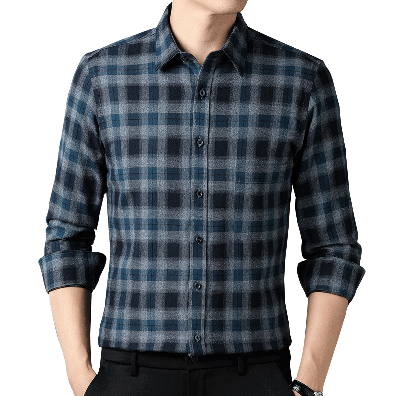 保罗秋冬季纯棉磨毛男士长袖衬衫中年休闲宽松全棉格子衬衣爸爸装