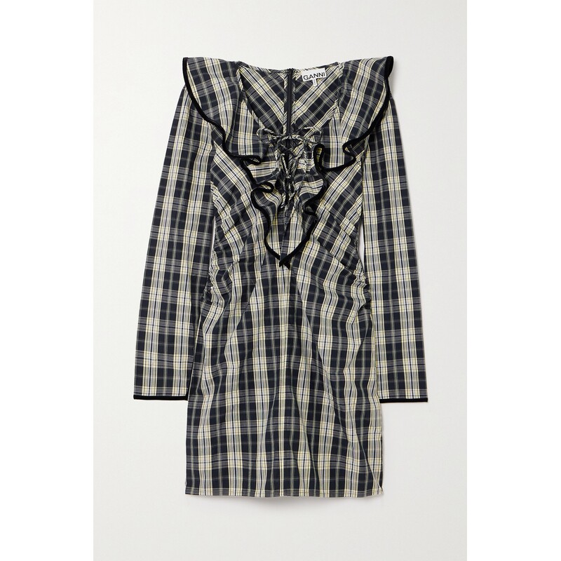 【38焕新周】GANNI女士天鹅绒边饰荷叶边棉质府绸迷你连衣裙