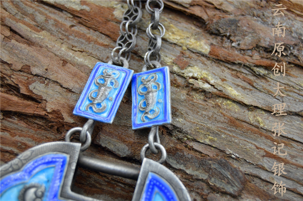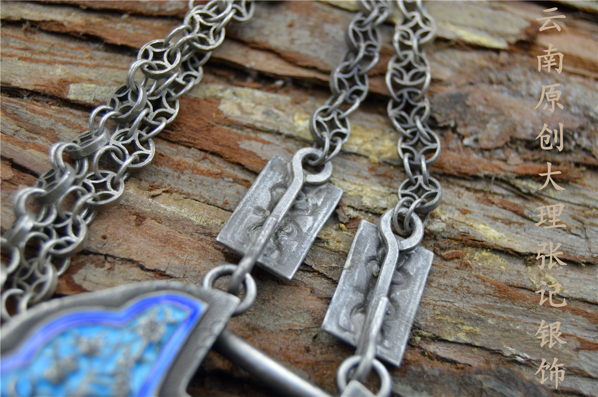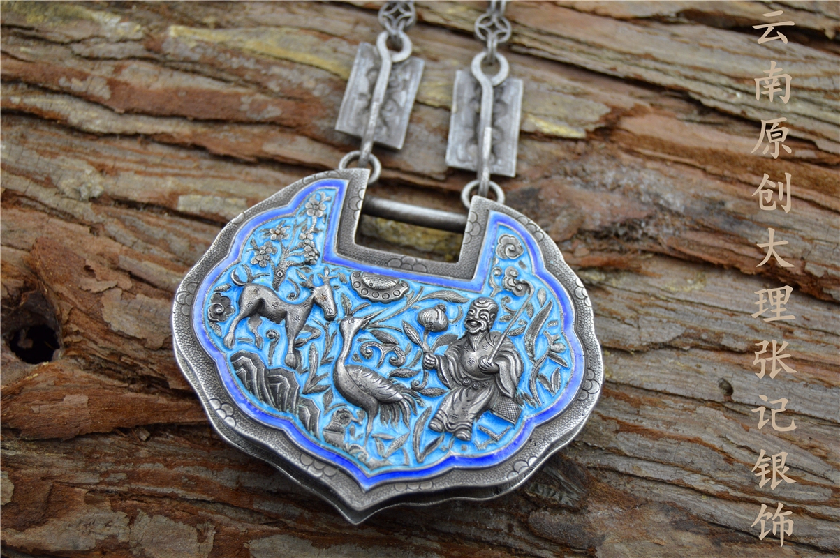 张记原创纯银古法手工传统题材鹤鹿同春寿星麒麟送子烧蓝银锁链子