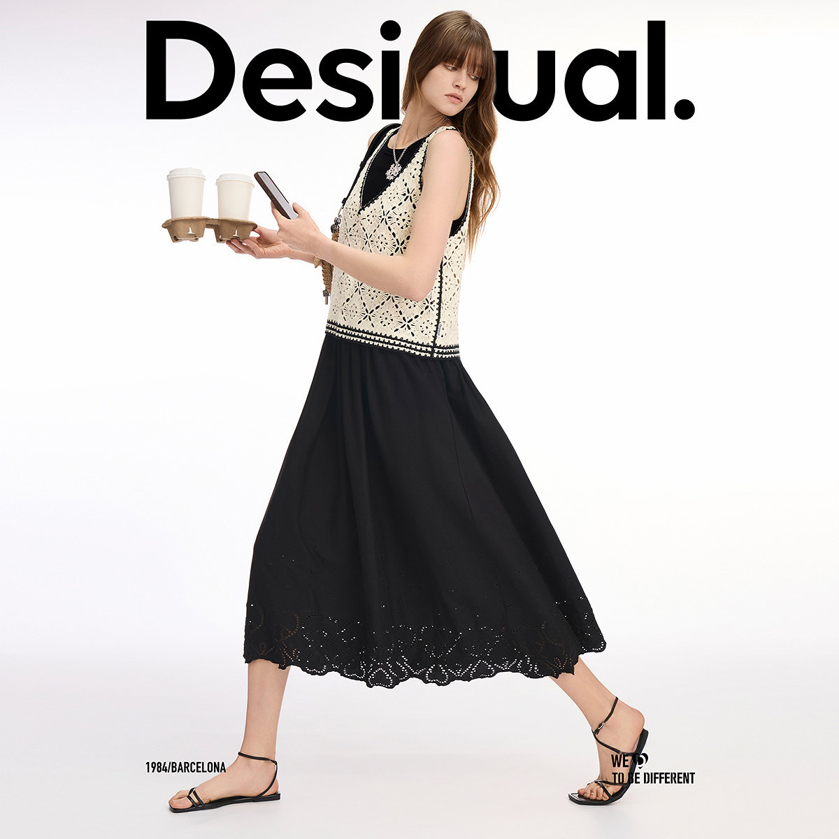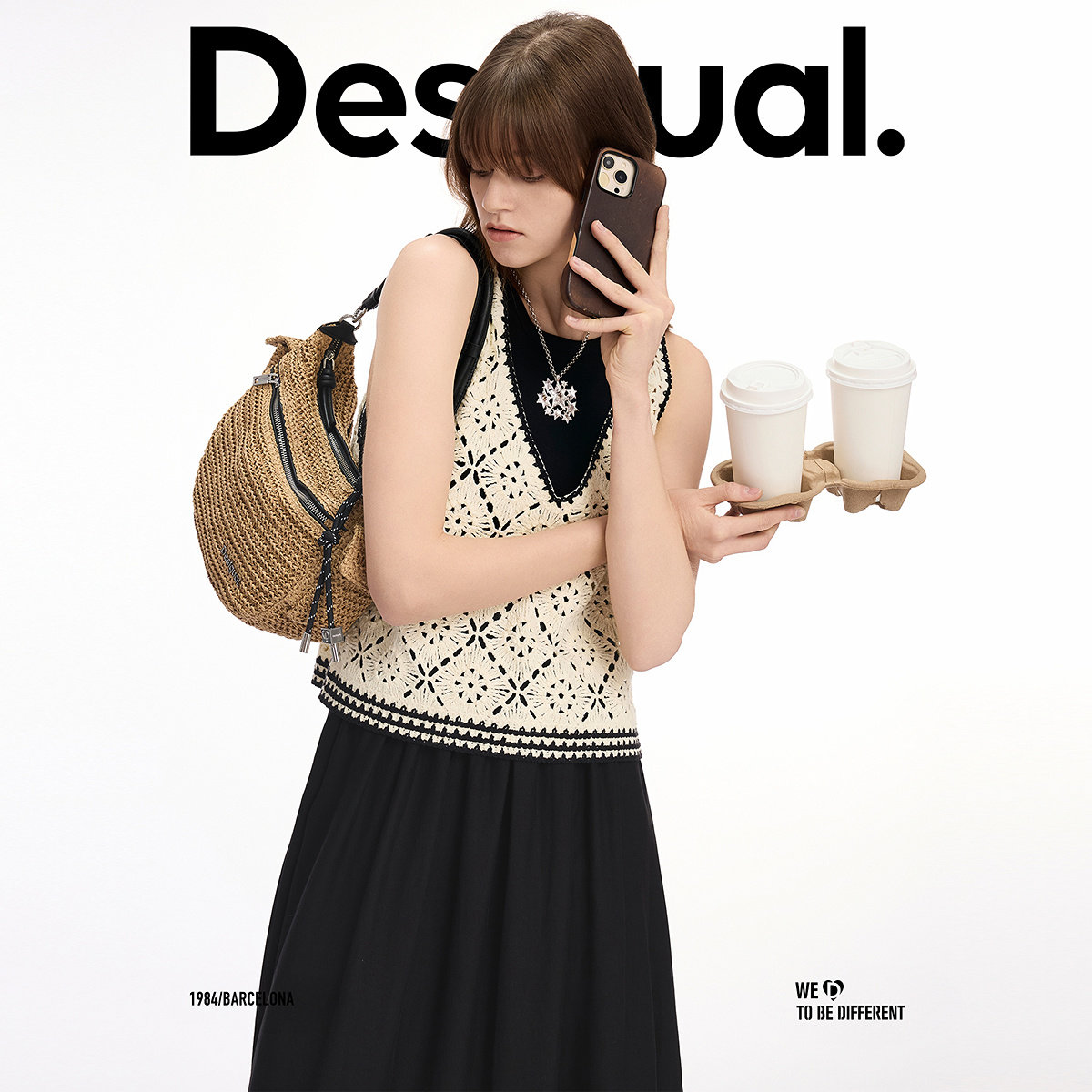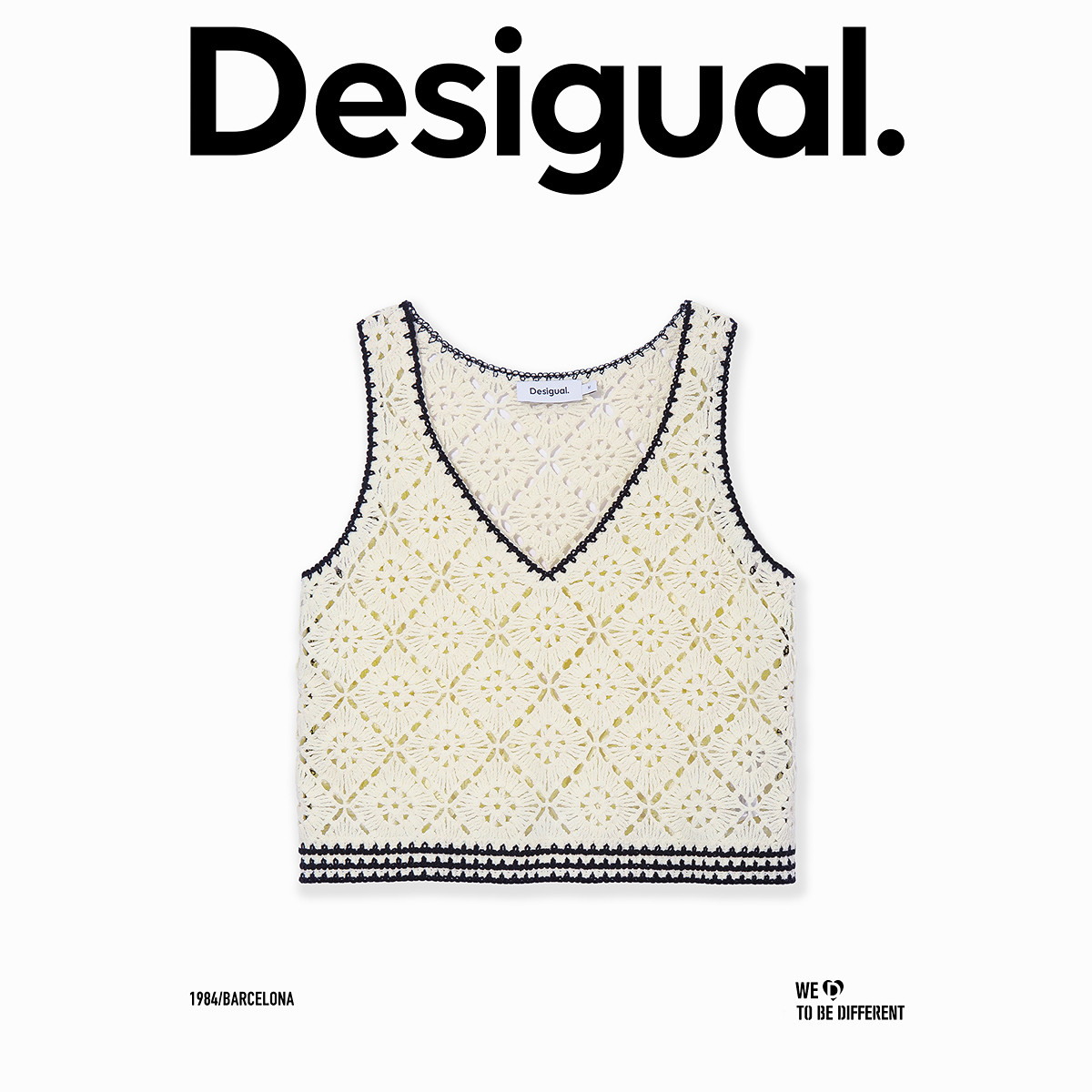 Desigual【明星同款】菱格镂空钩针无袖女士针织背心V领上衣女