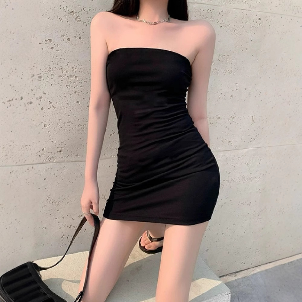 黑色一字领修身抹胸连衣裙女2025年新款春夏性感收腰包臀裙子