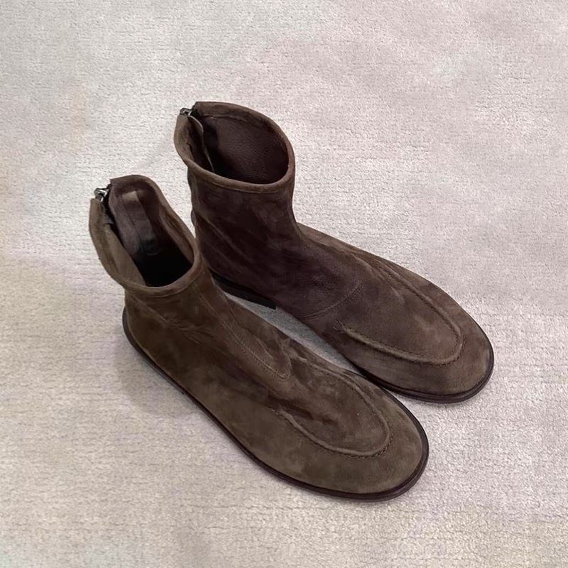 英伦风圆头平底后拉链短靴女