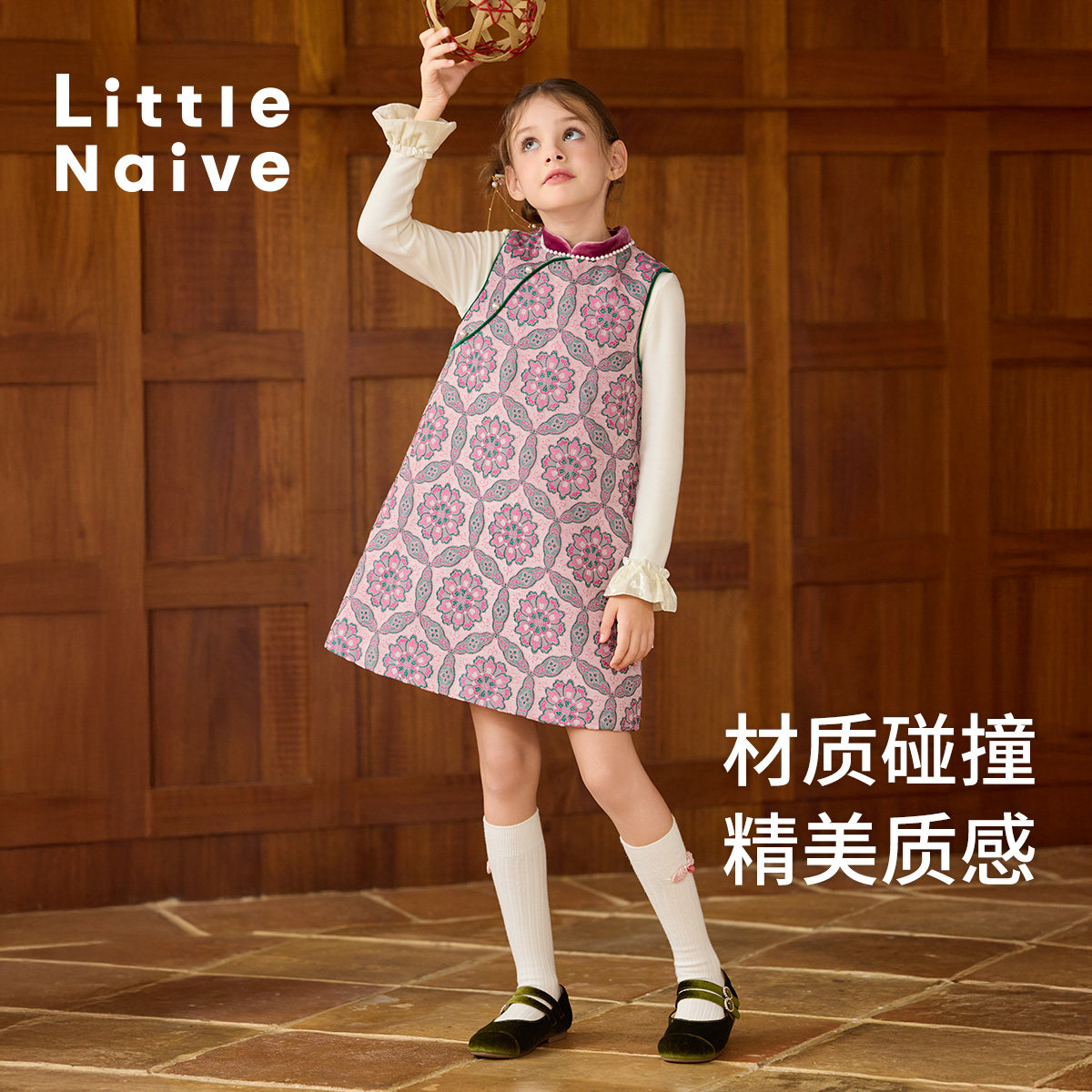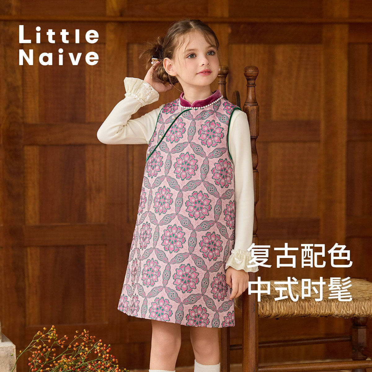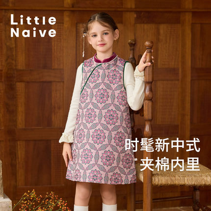 Little Naive儿童丝绒背心裙冬季保暖夹棉连衣裙女童中式红色裙子