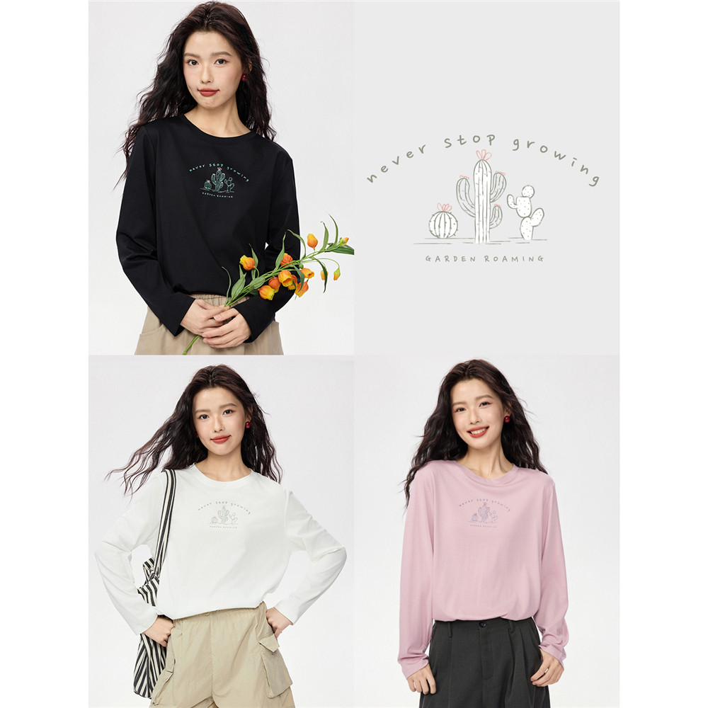 佐丹奴长袖T恤女2026年春新款纯棉植物印花宽松圆领上衣13325555