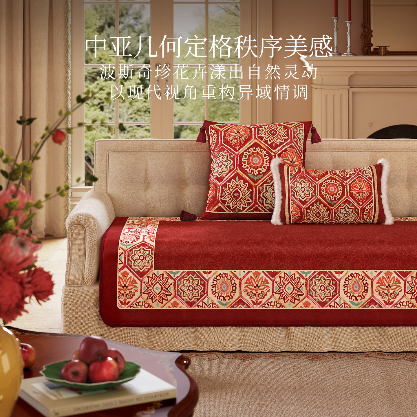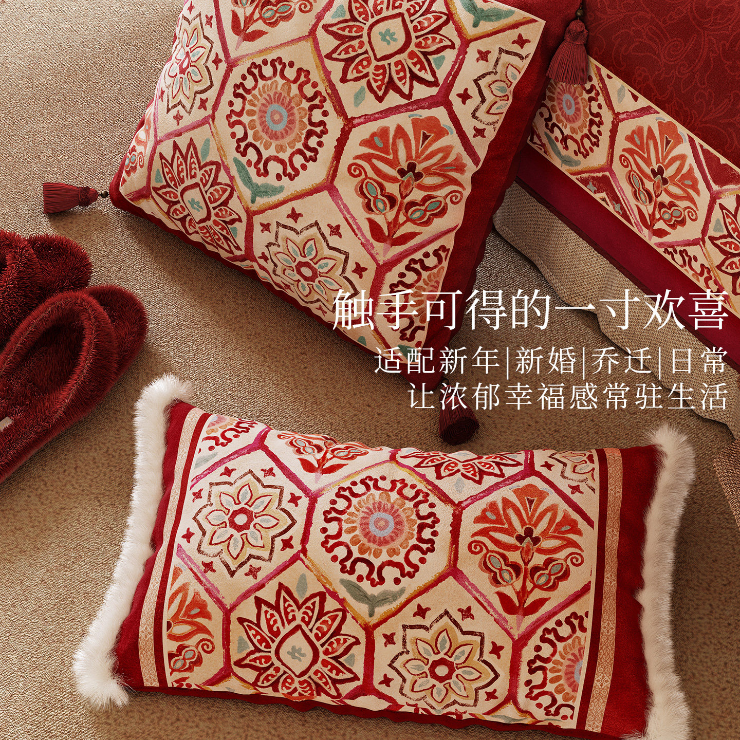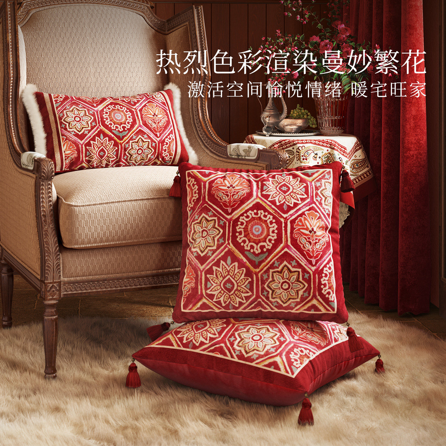 范居态度梵彩美式复古红色新年抱枕客厅沙发毛绒垫腰靠枕可拆洗