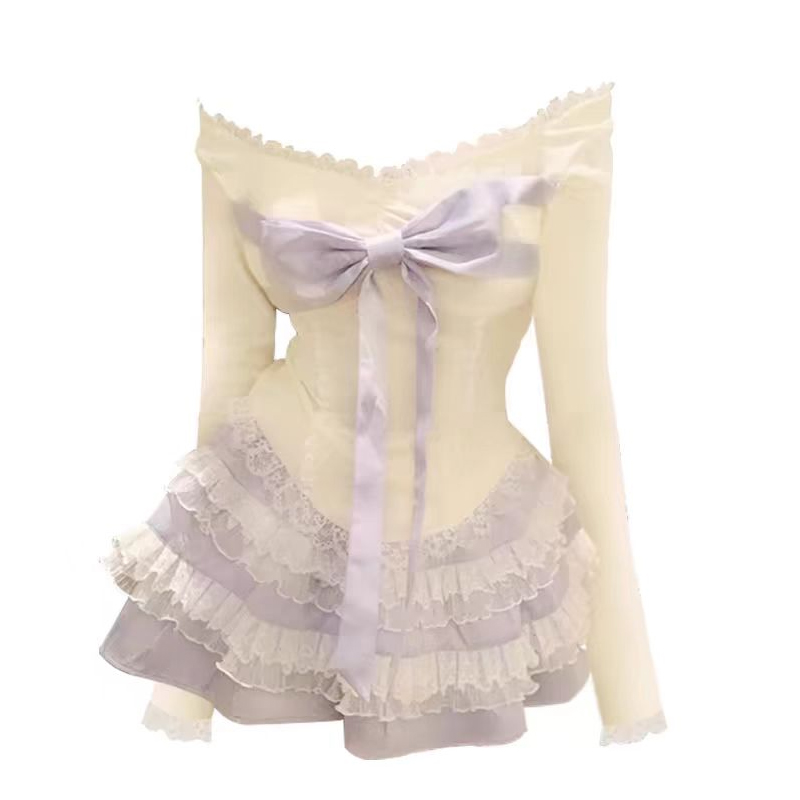 芋泥蛋糕 春季森系甜美氛围感纯欲显瘦蝴蝶结方领上衣短裙两件套