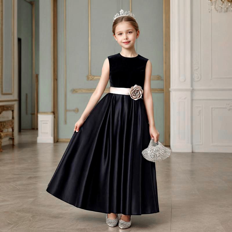 女童礼服高端黑色绒面简约显瘦气质公主裙小女孩主持人钢琴演出服