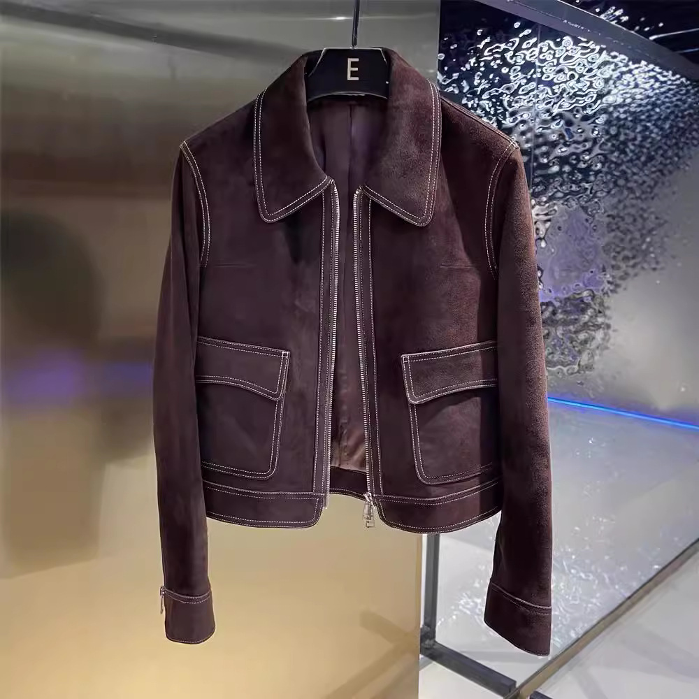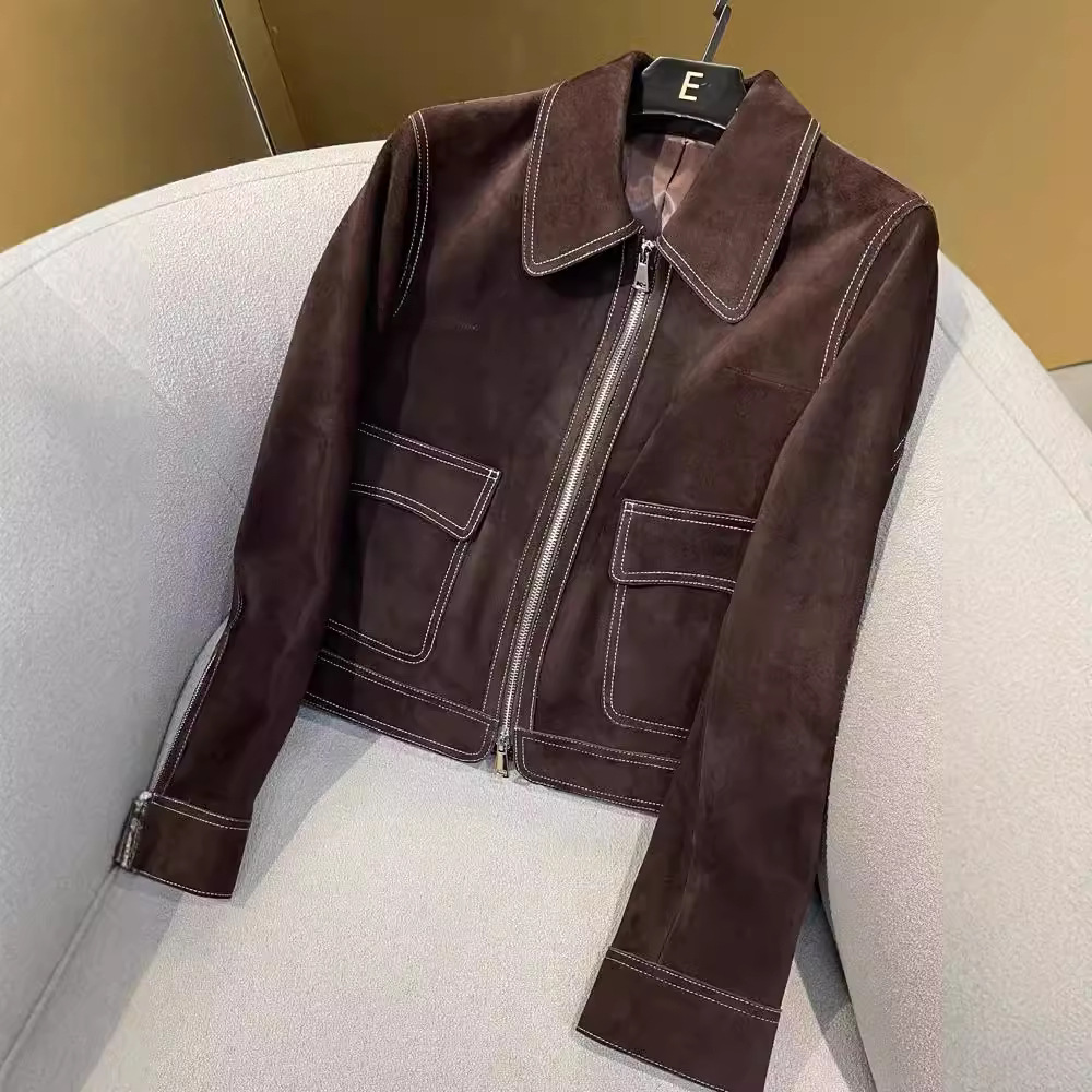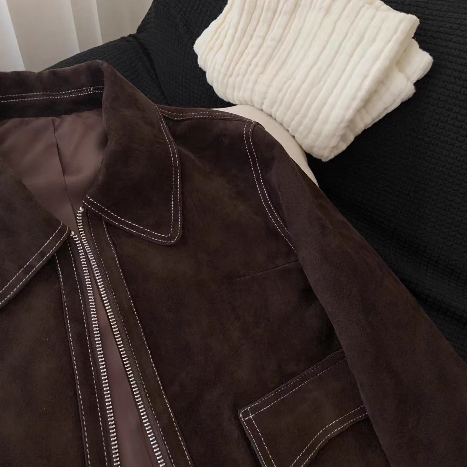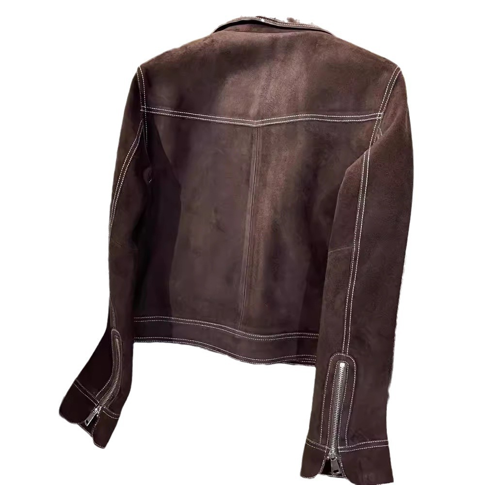 2025高定外单新款时尚反绒羊皮复古港风做旧真皮皮衣女短夹克外套