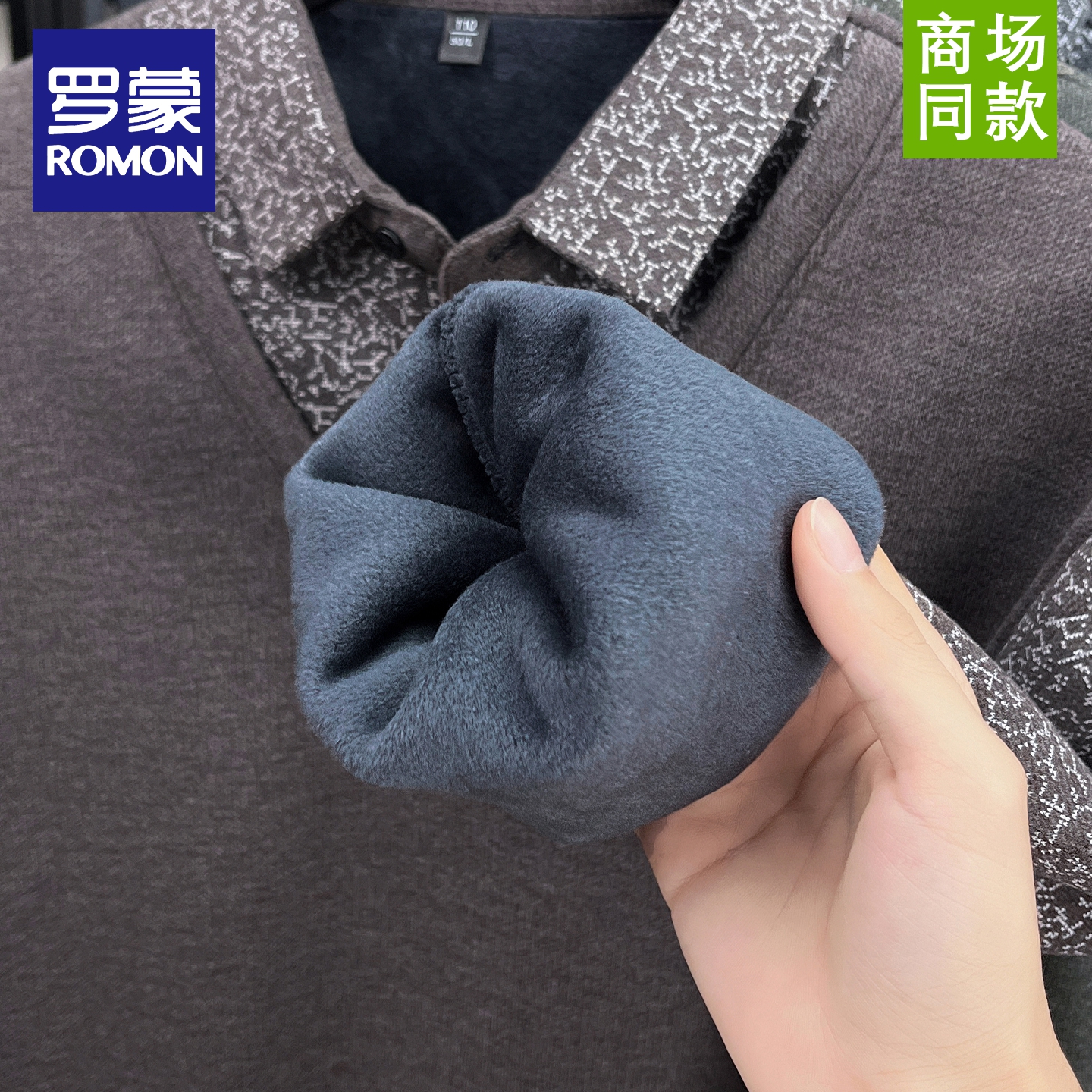 罗蒙男士2025年冬季新款商务休闲印花假两件含羊毛加绒加厚毛衣