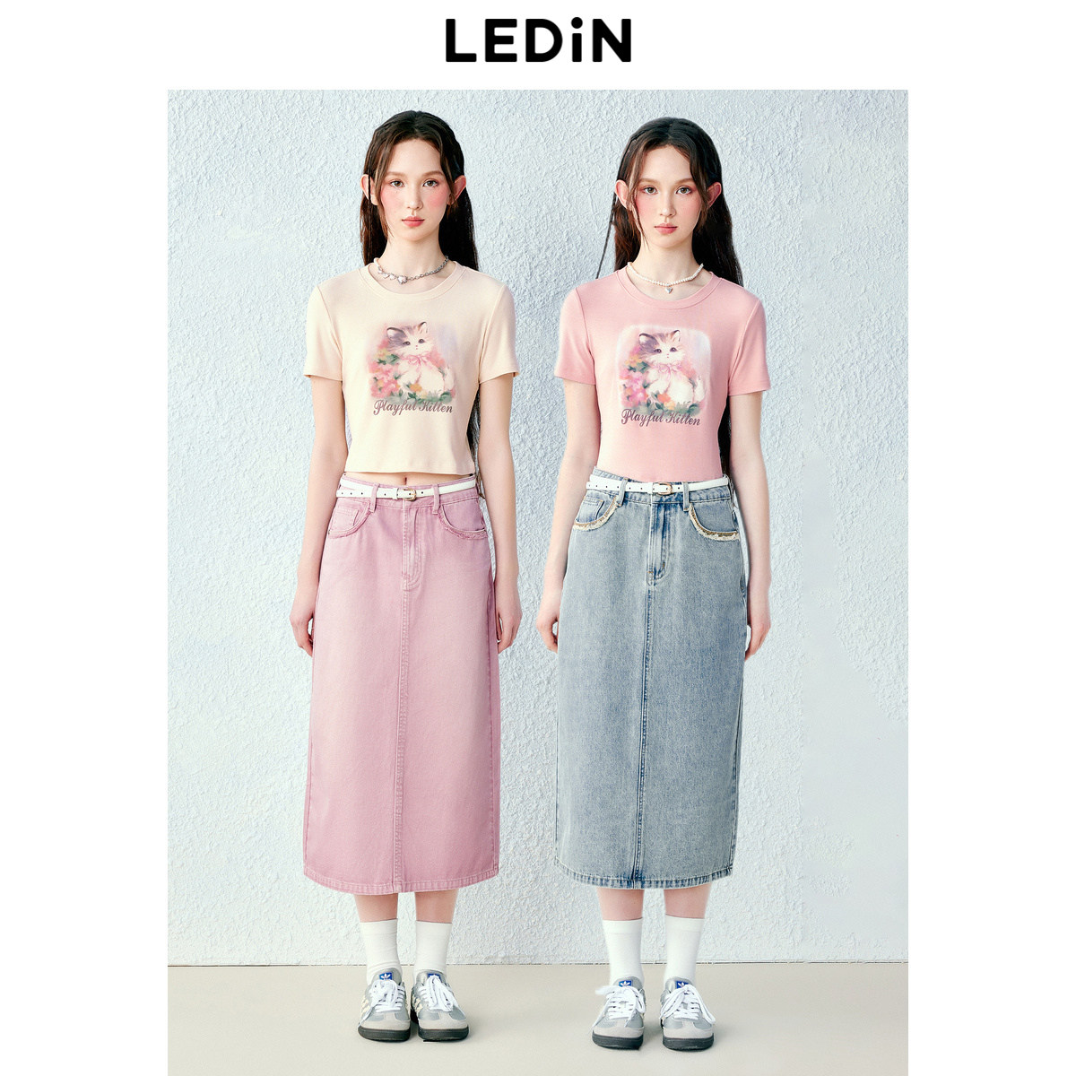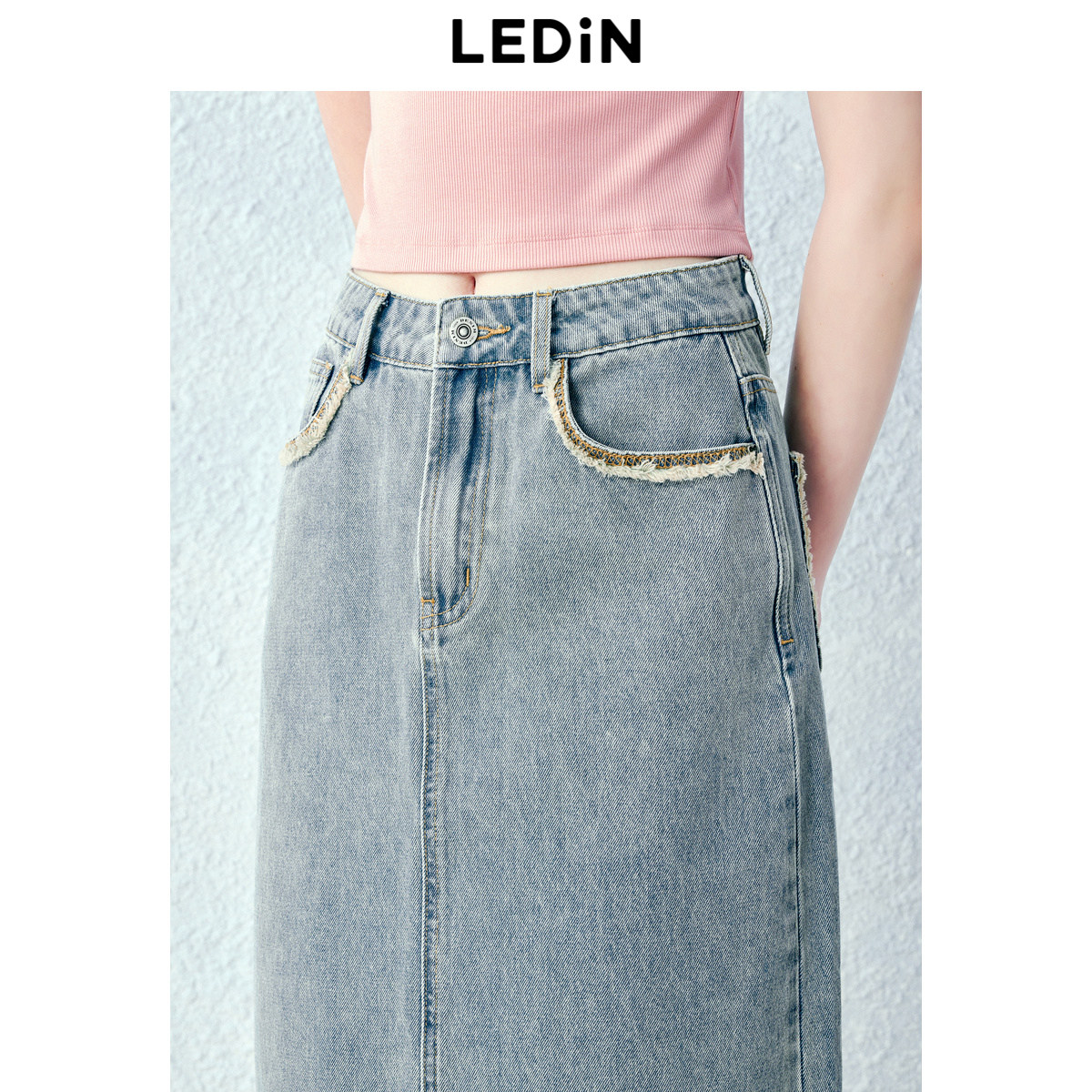 乐町牛仔半身裙夏季女装毛边开叉长裙清新彩牛直筒半身裙