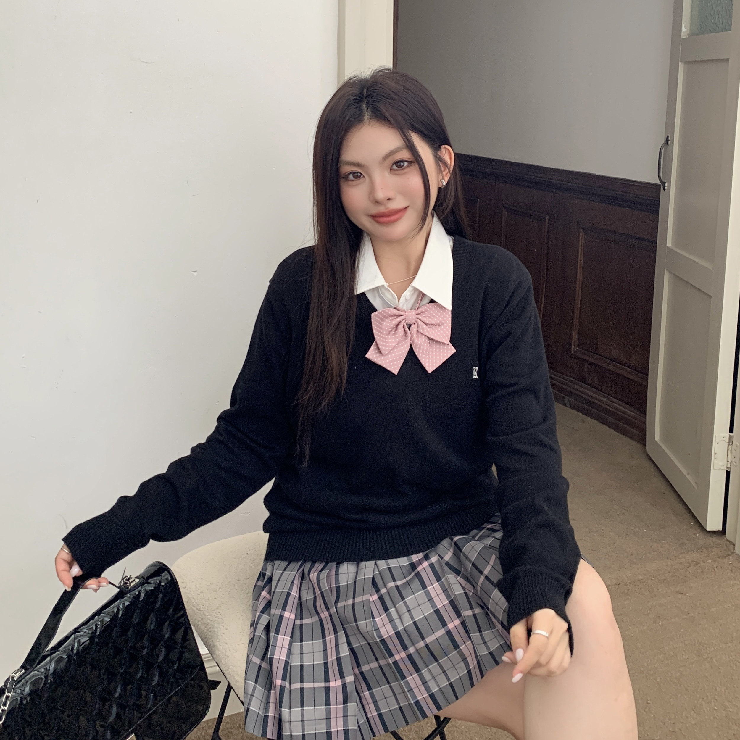 阿车家的大码jk胖mm原创V领长袖毛衣外套衬衫格裙学院风显瘦套装