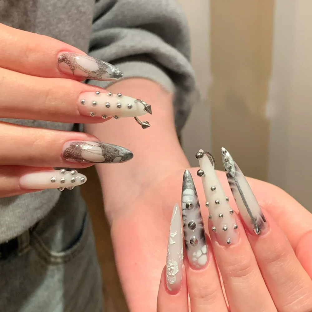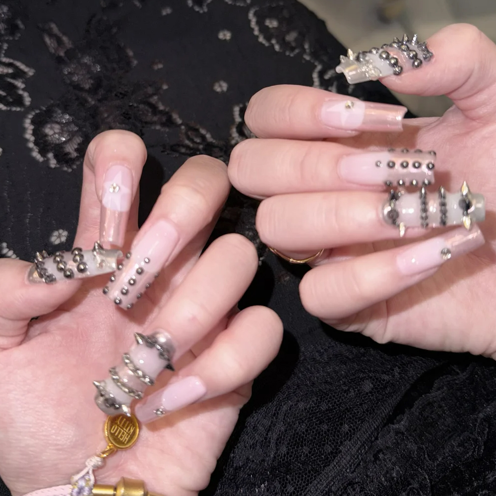 ins新款美甲diy圆锥半圆饰品盒装枪灰银铆钉朋克子弹头指甲配饰品
