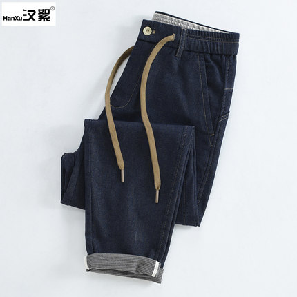 汉絮菠萝纹牛仔裤男士秋季松紧腰系带直筒裤青年百搭男装九分裤子
