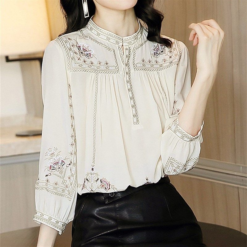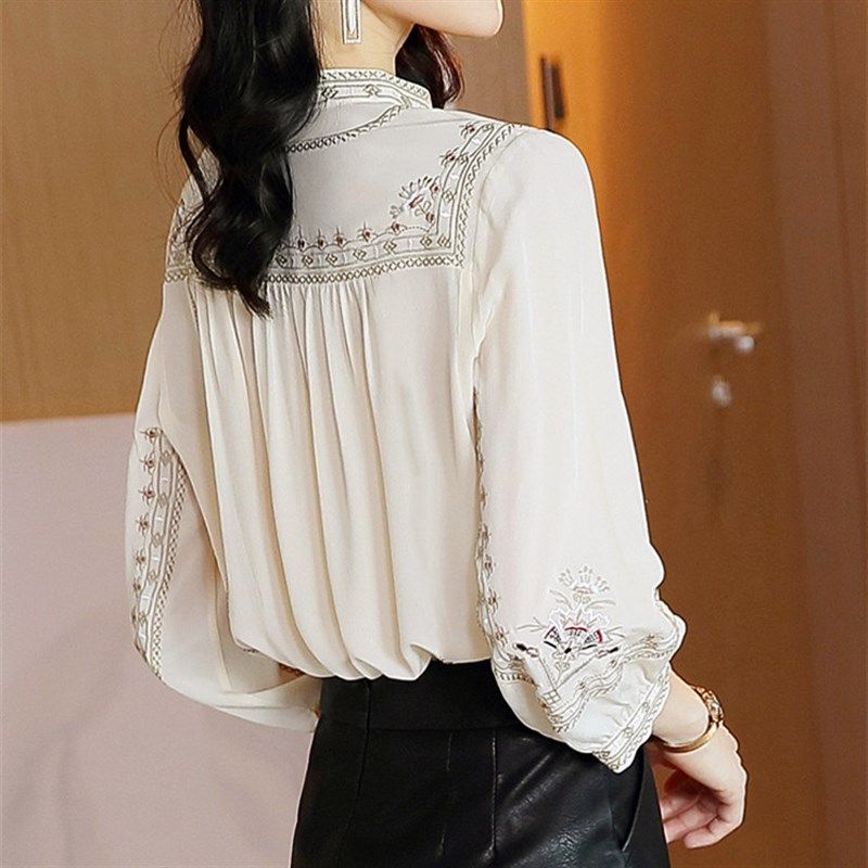 快速发货外c贸女装印花雪纺衬衫女长袖灯笼袖立领杏色衬衣2022年