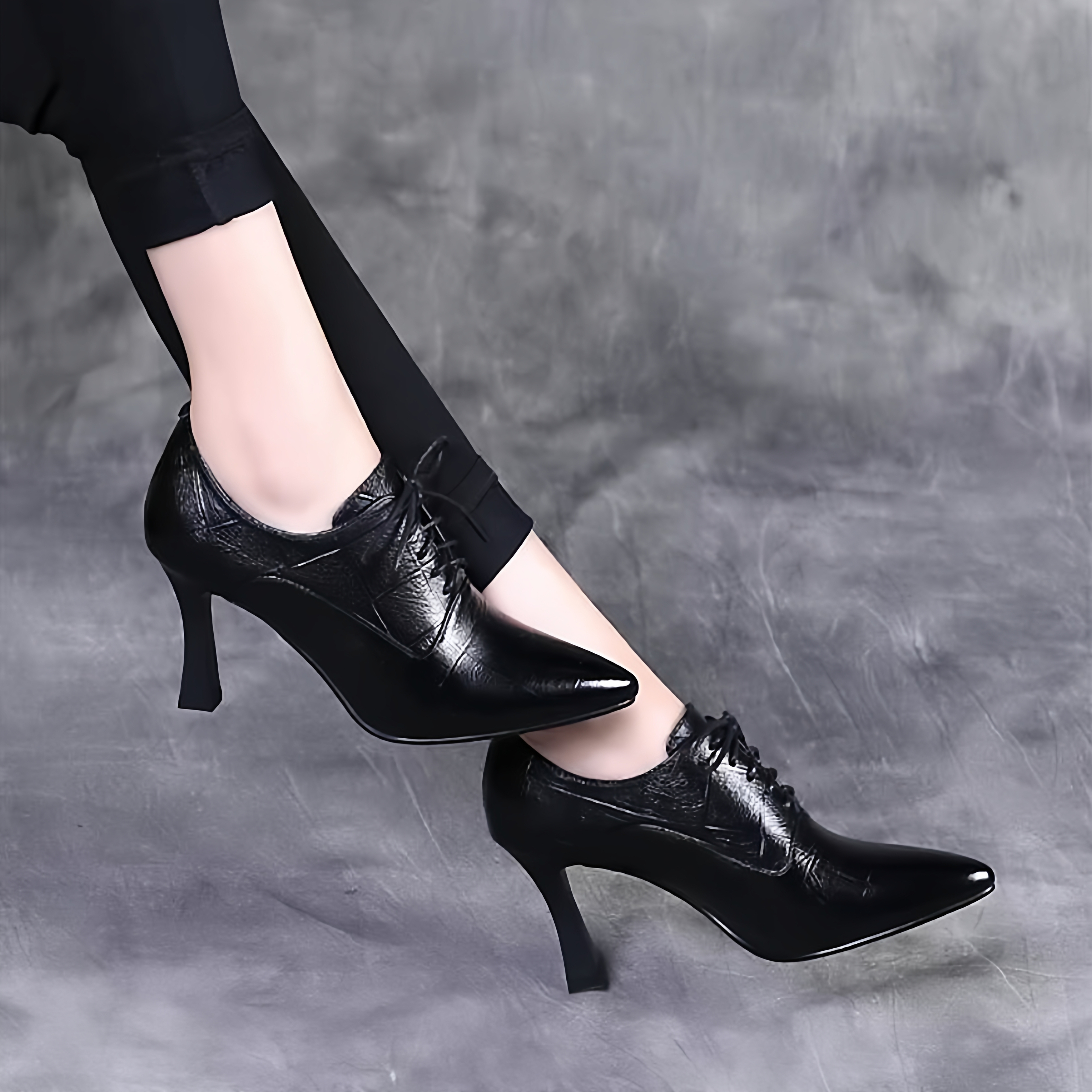 黑色真皮系带尖头高跟鞋女粗跟职场通勤气质百搭时尚单鞋子小皮鞋