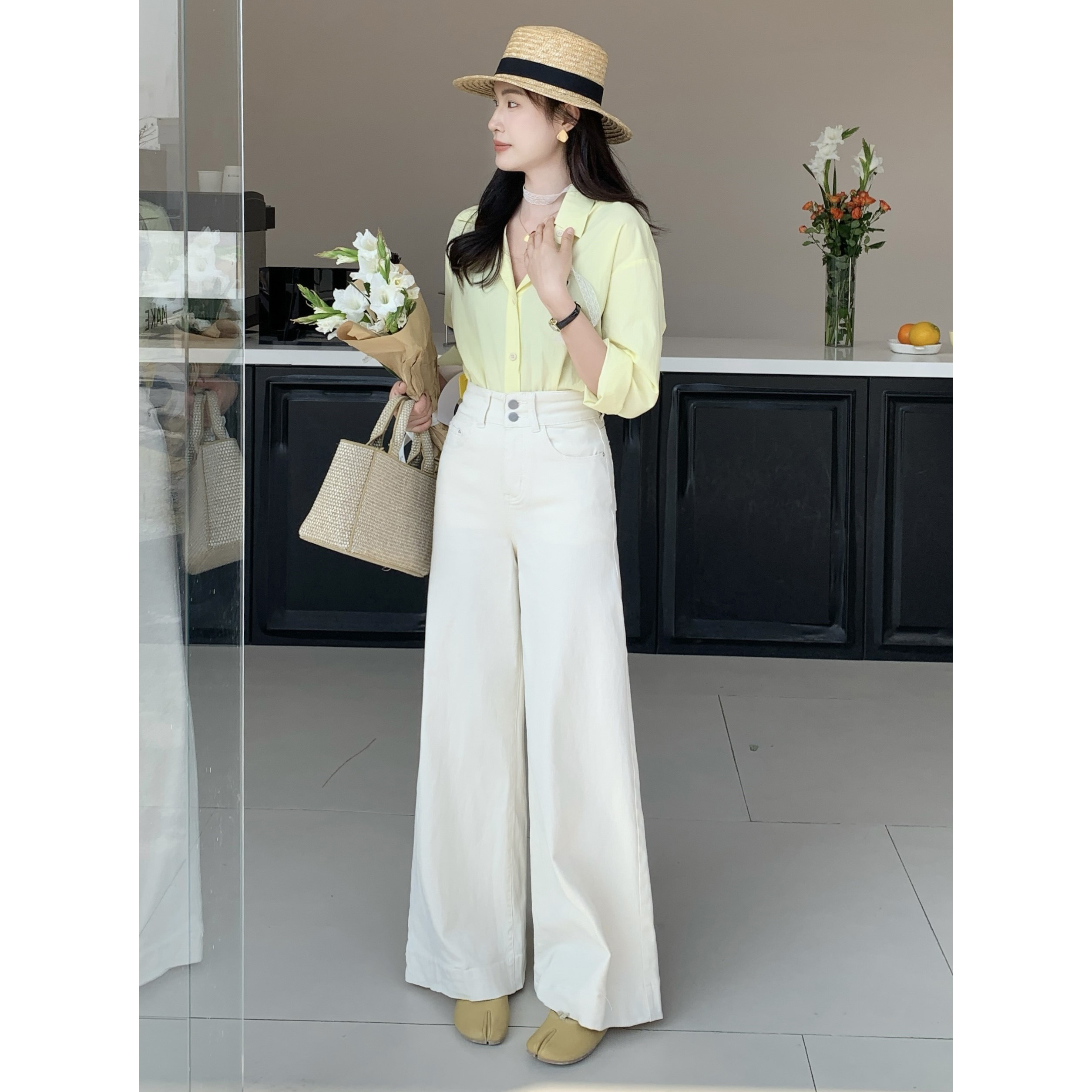 米白加绒高腰喇叭大阔脚牛仔裤女爆款秋冬小个子弹力显瘦垂感裤子