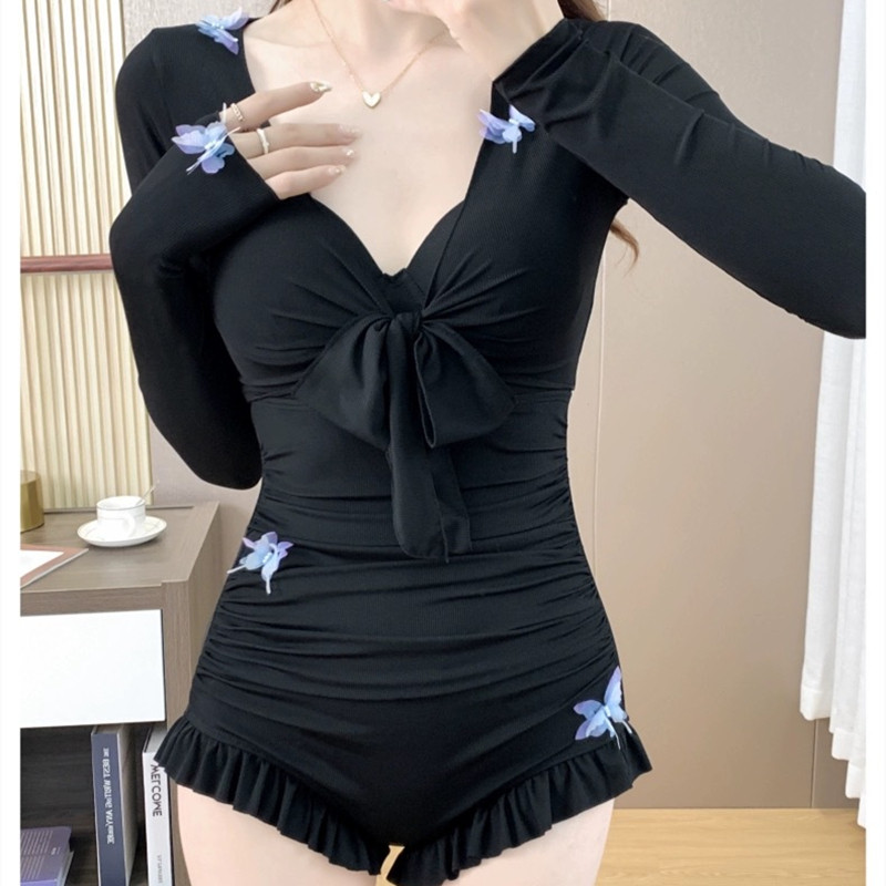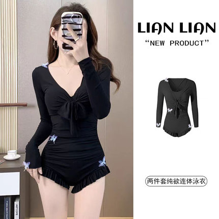 韩国ins夏季纯欲网红少女保守显瘦长袖吊带连体三角泳衣温泉泳装