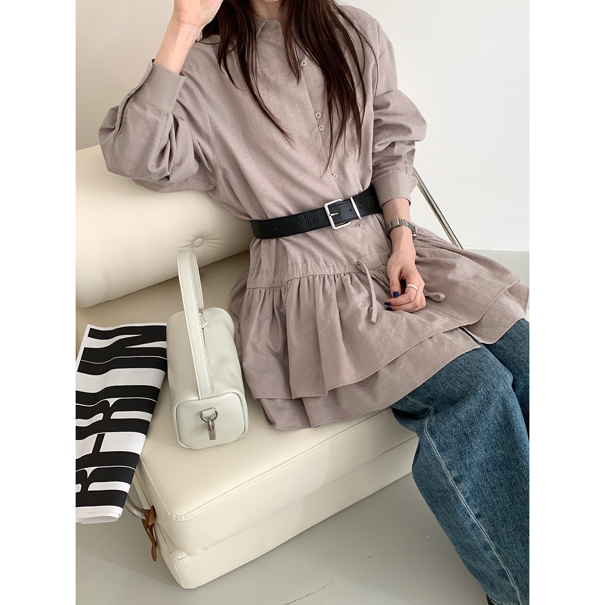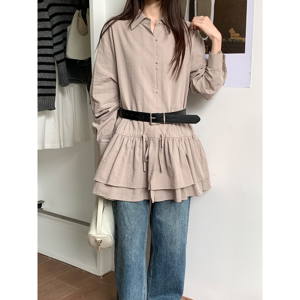翻领衬衫连衣裙设计感小众蛋糕裙秋季新款抽绳收腰长袖a字短ce78