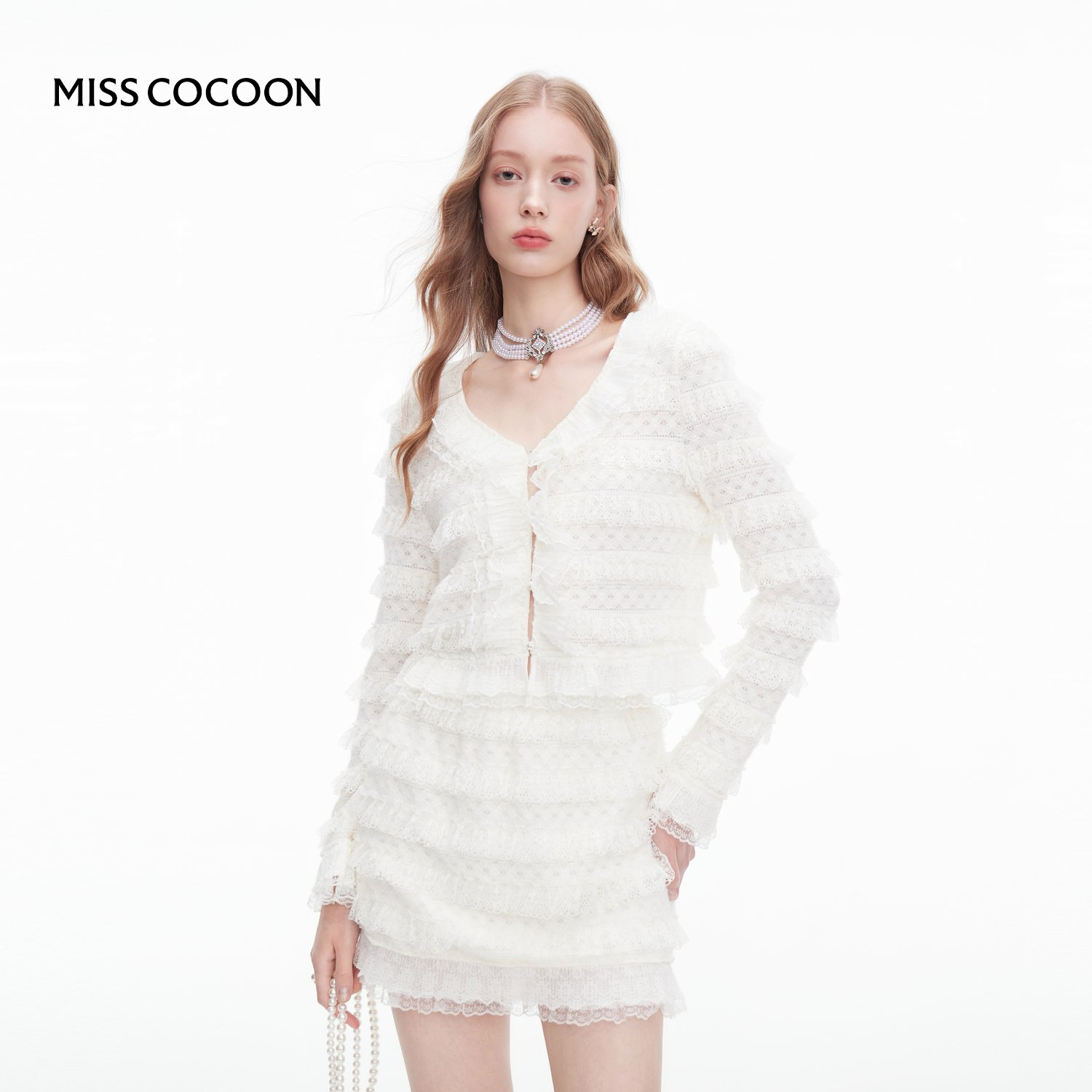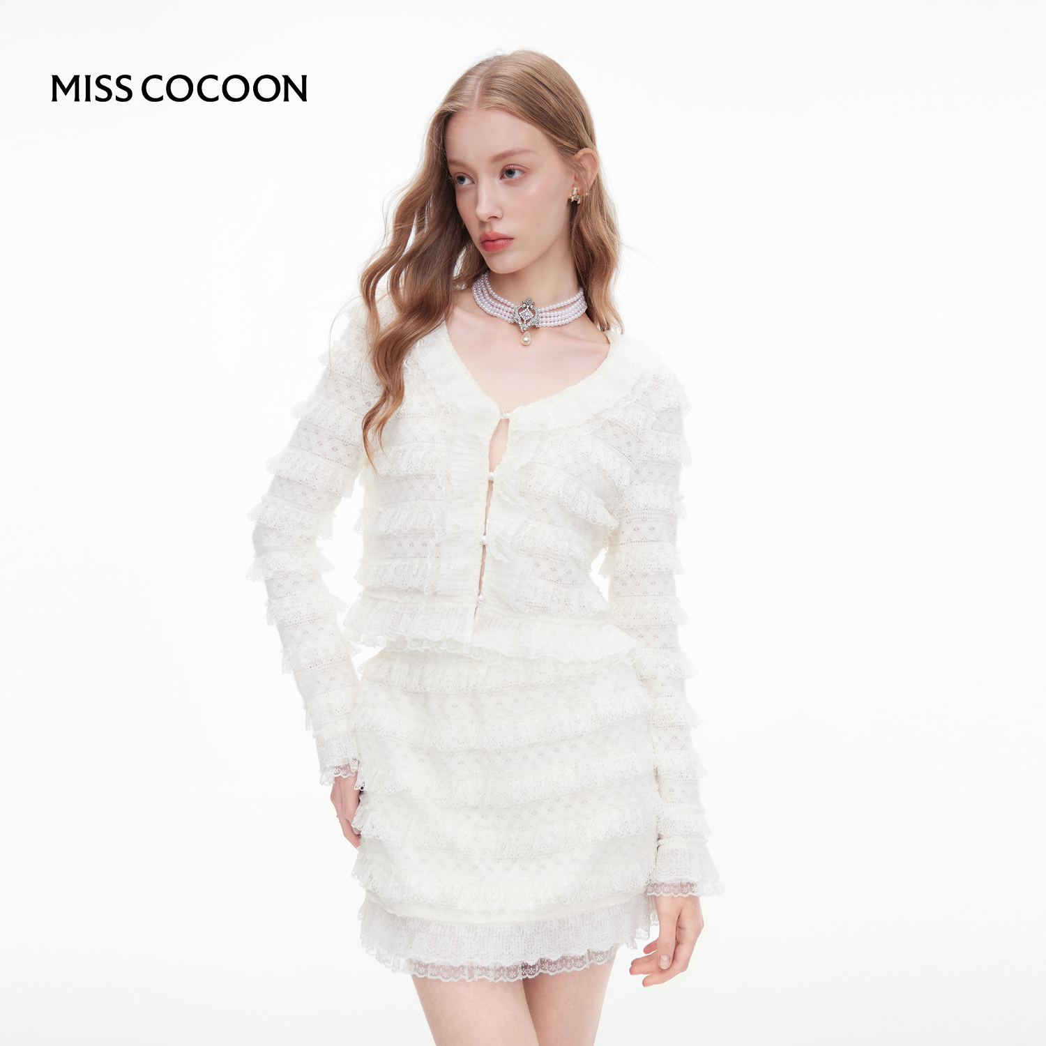 MISSCOCOON可可尼白色蛋糕裙女2025冬季新款法式蕾丝长袖连衣裙