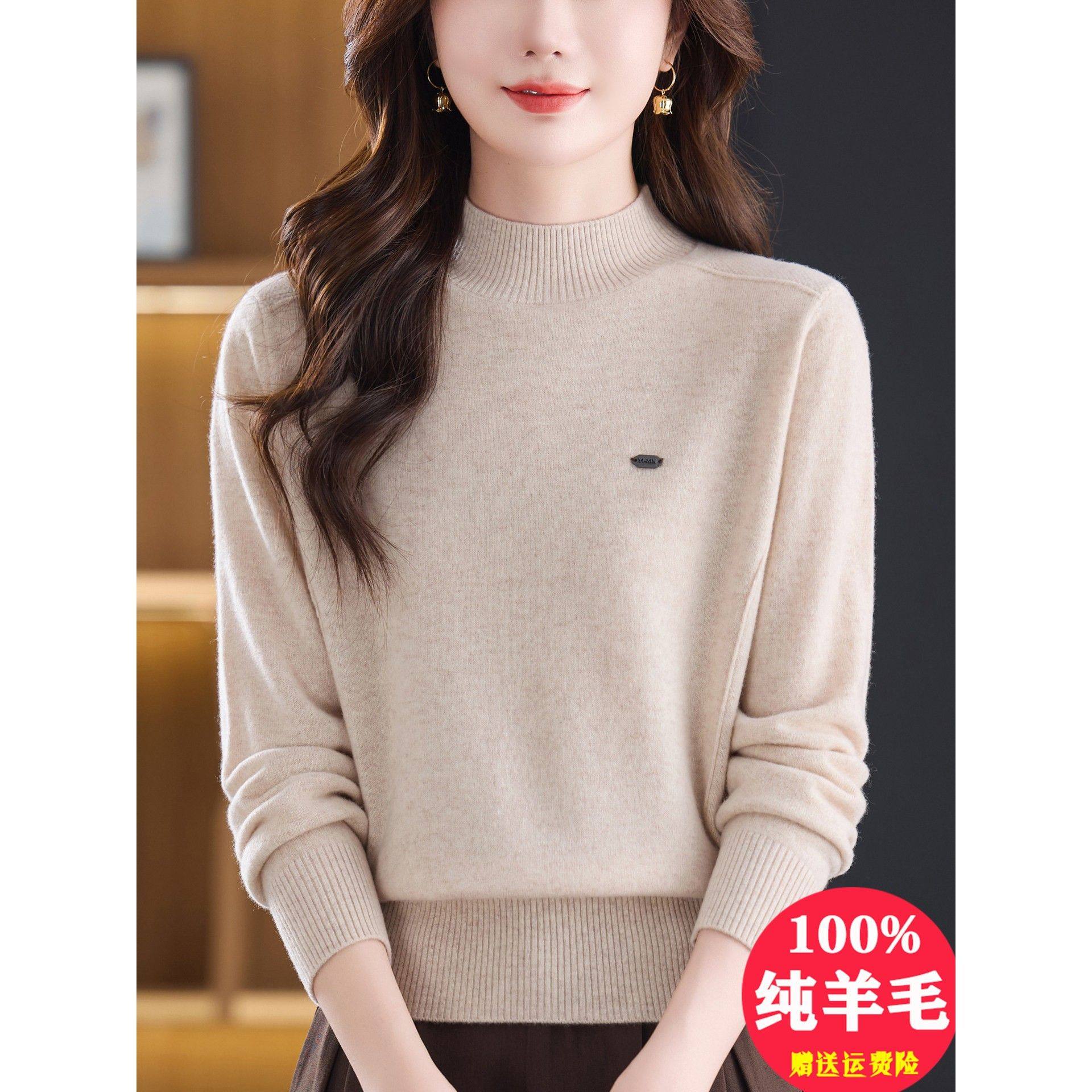 高档灰色纯羊毛衫女套头半高领毛衣秋冬妈妈宽松内搭针织打底上衣