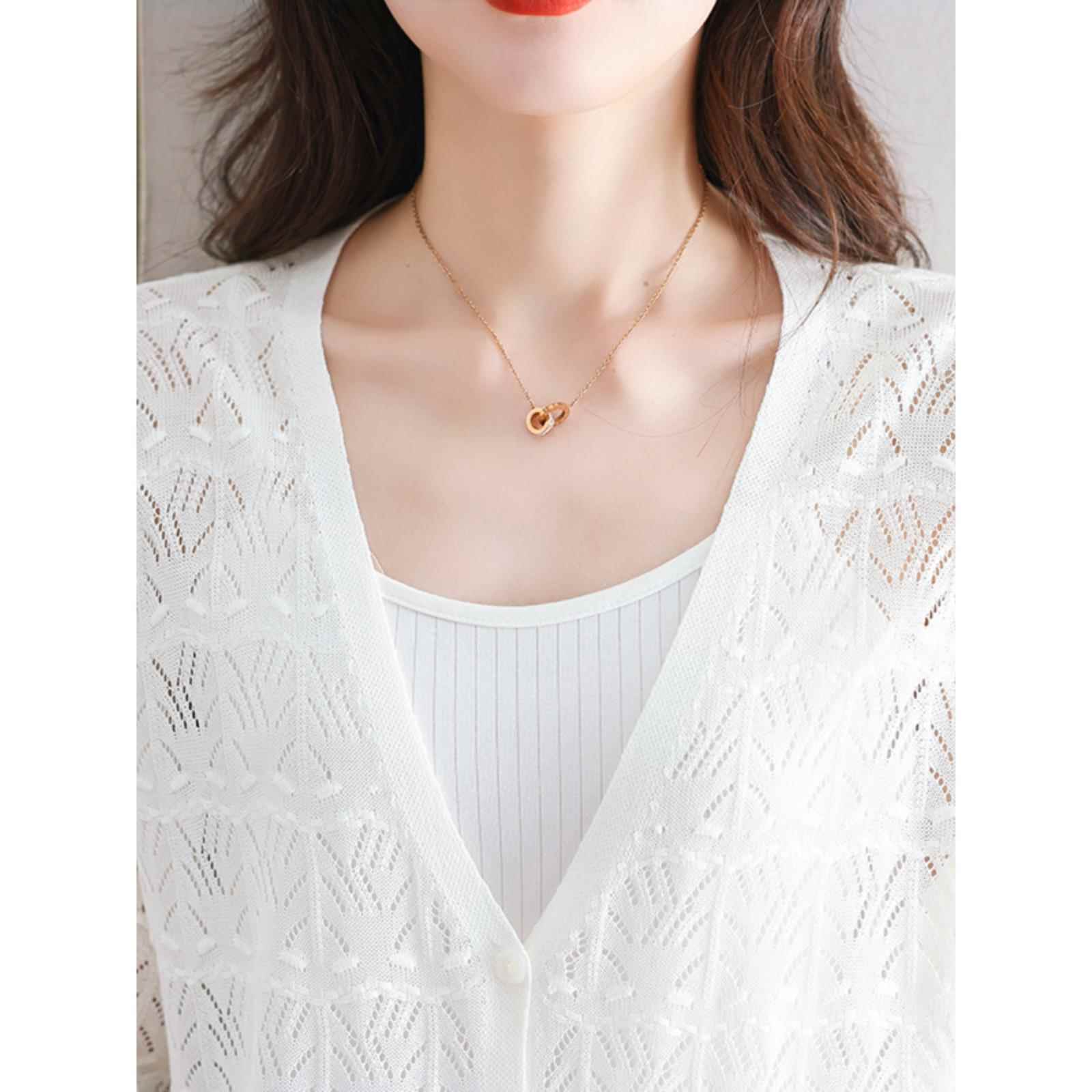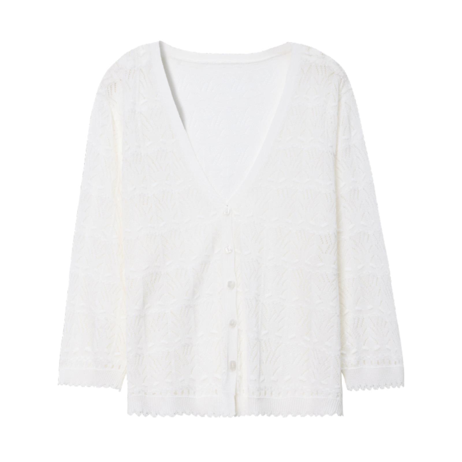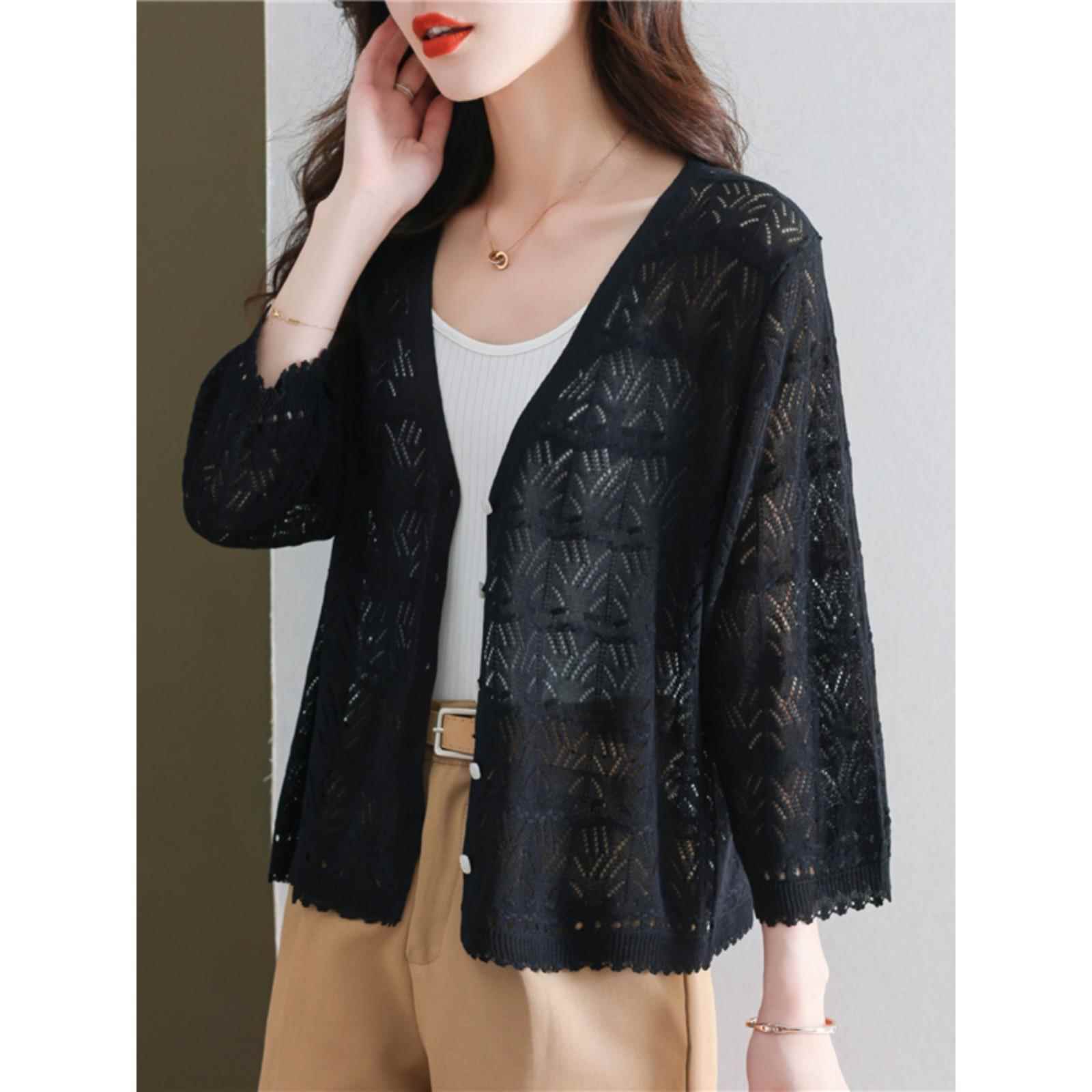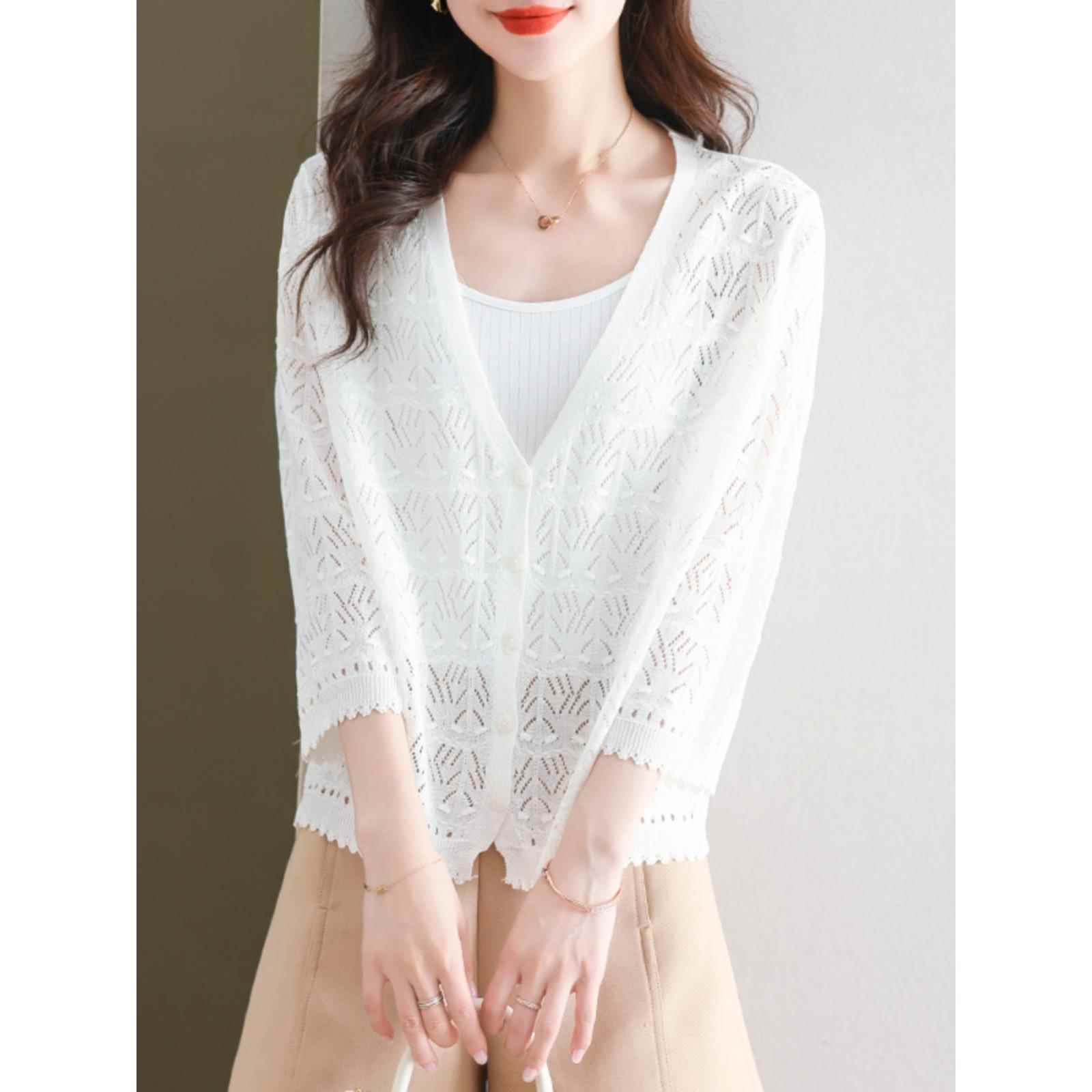白色冰丝针织防晒开衫女镂空薄披肩外搭v领空调衫七分袖短款坎肩