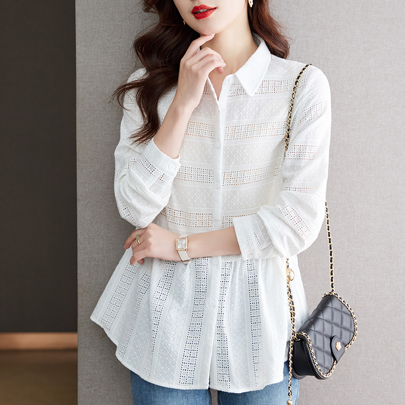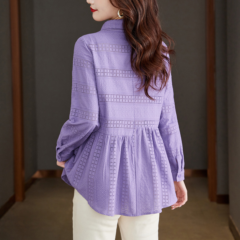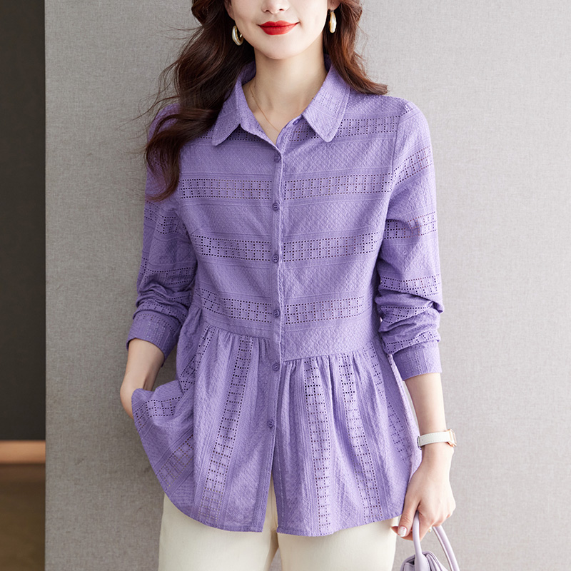 初影紫色显肤白衬衫女长袖2025新款设计感娃娃衫上衣纯棉刺绣衬衣
