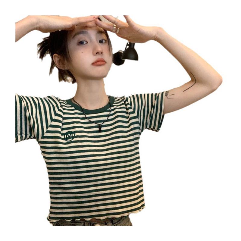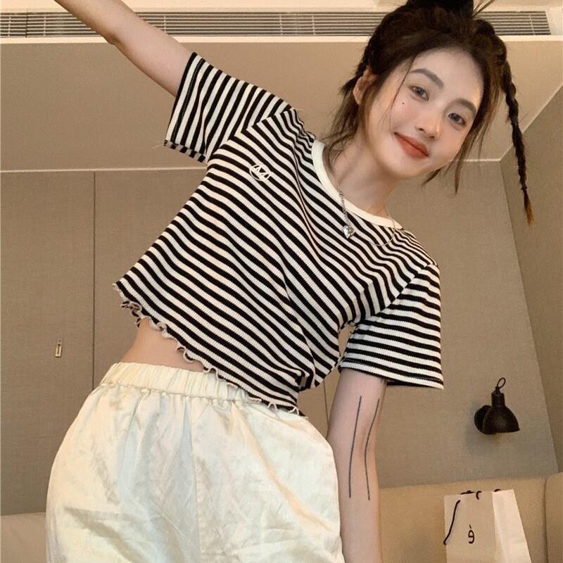 百搭条纹短袖t恤女ins潮夏季2025新款韩版设计感修身短款学生上衣