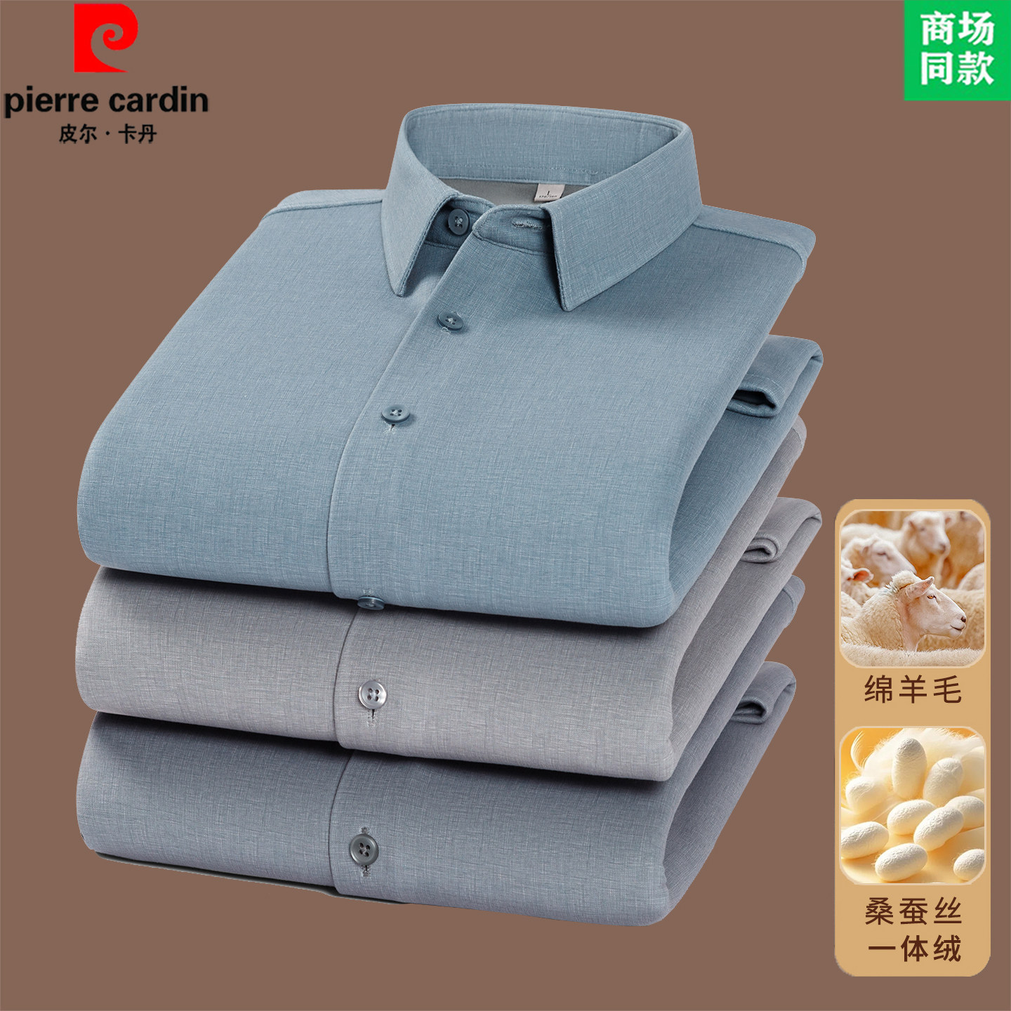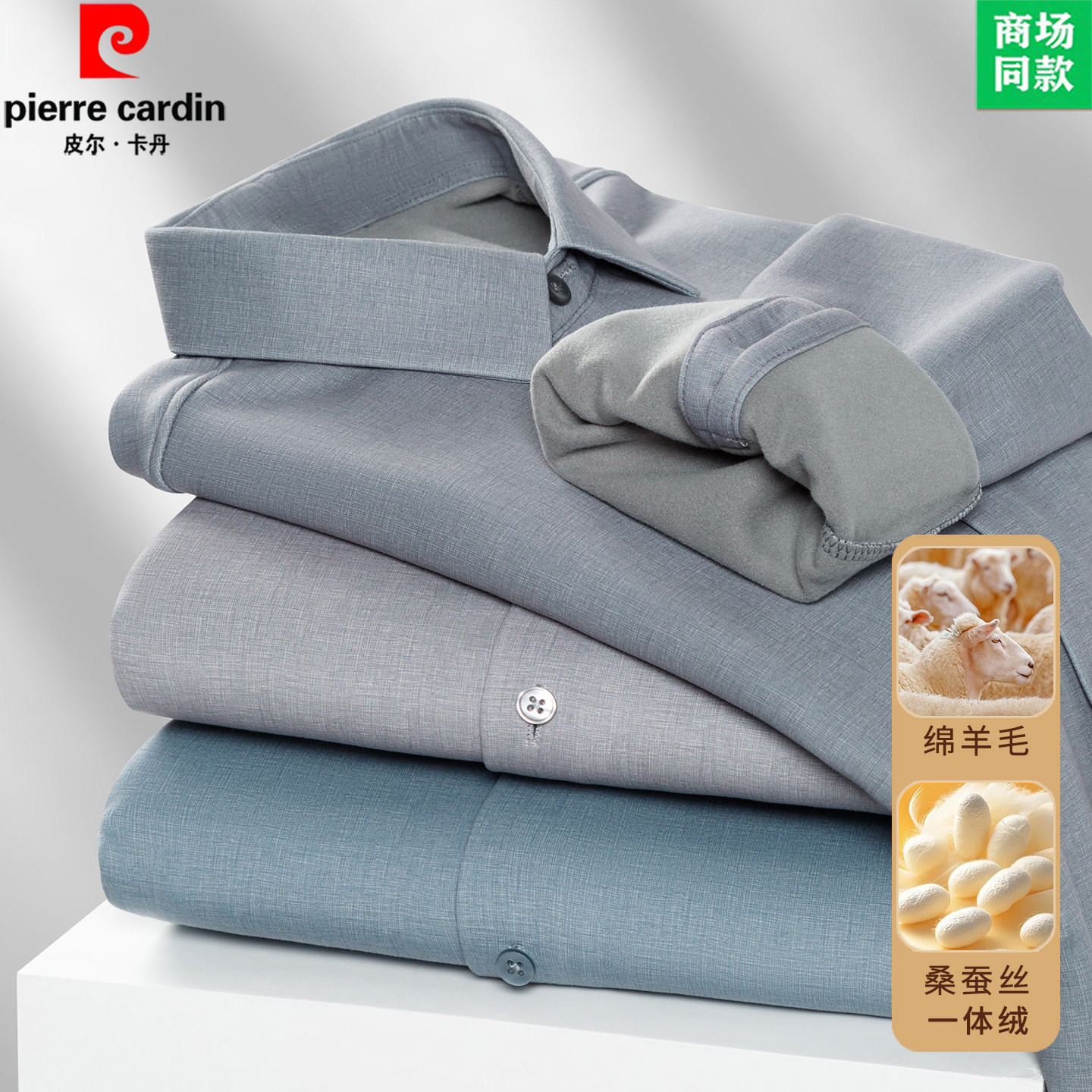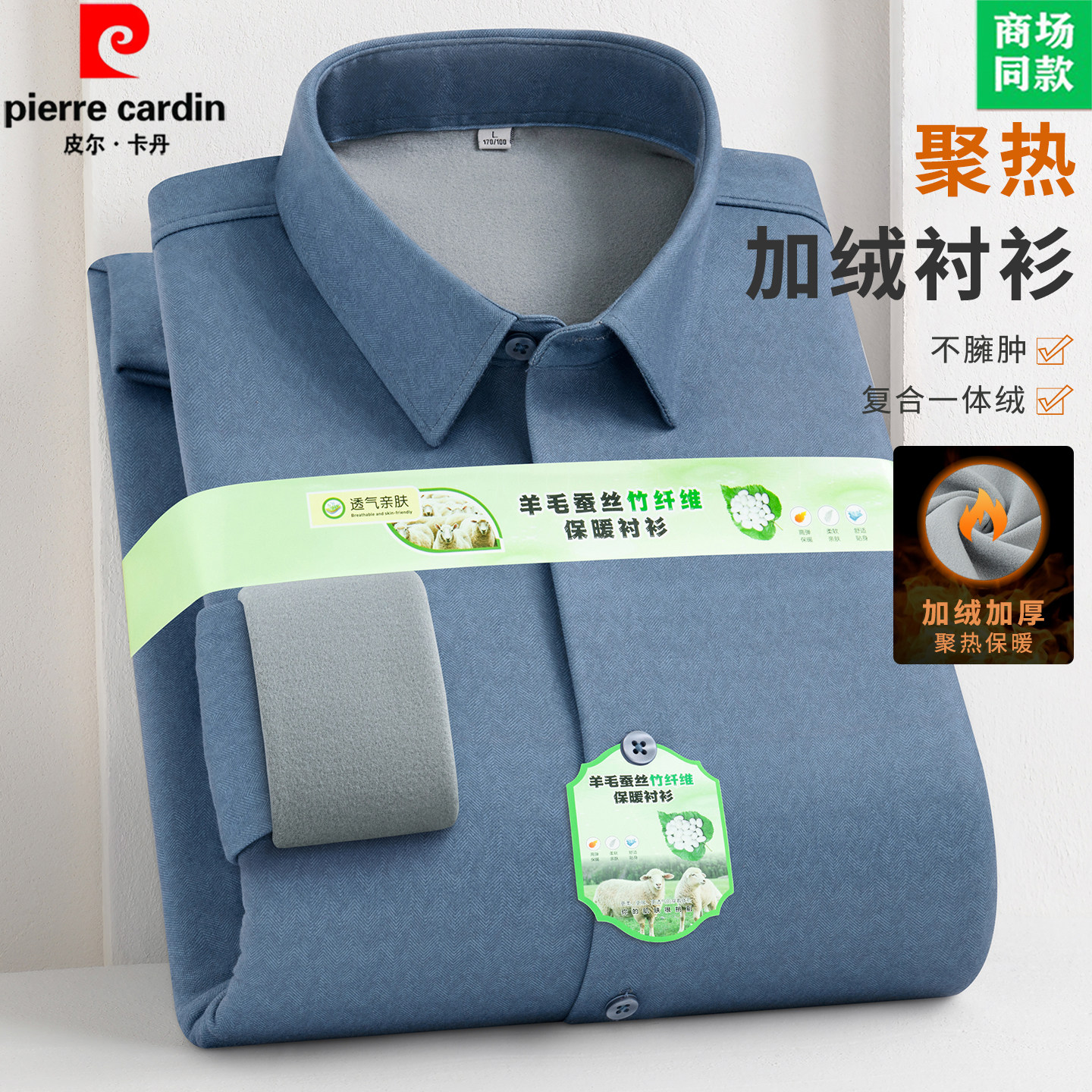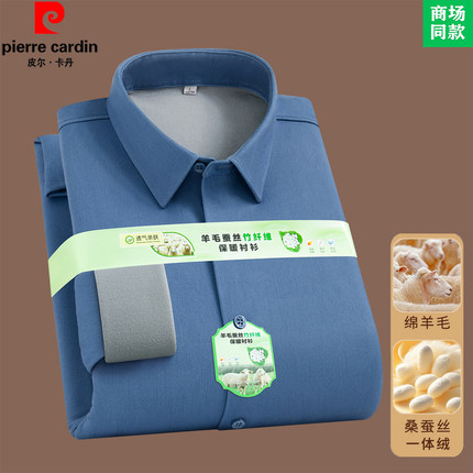 皮尔卡丹高端羊毛蚕丝保暖衬衫男士冬季加绒加厚商务正装工装衬衣