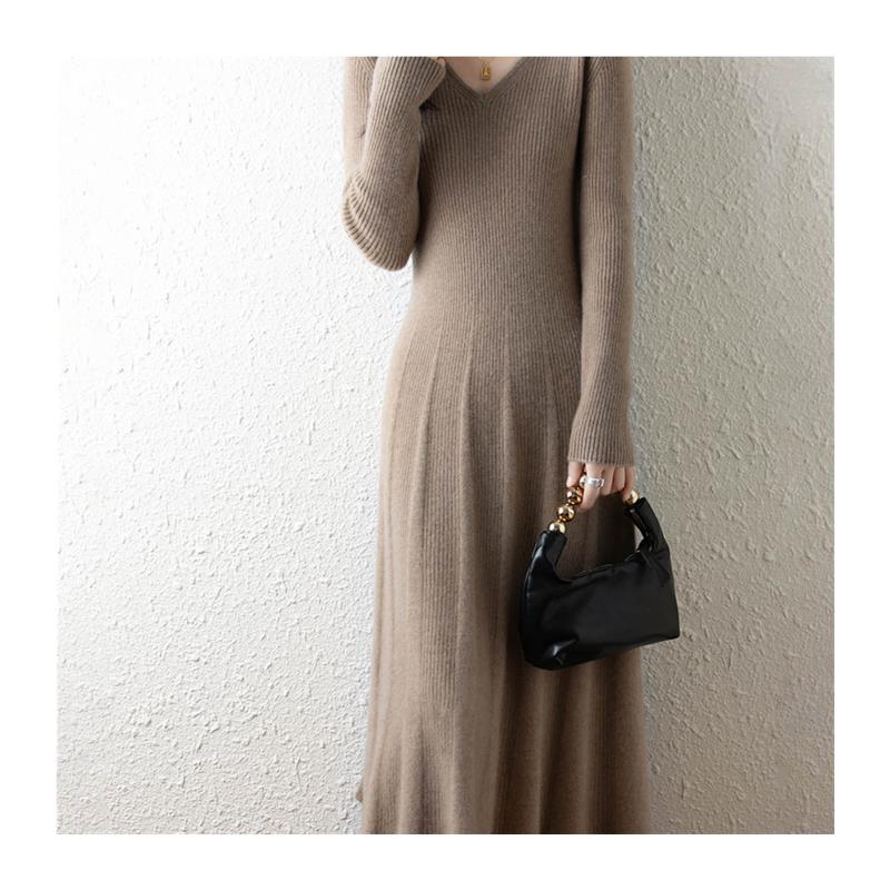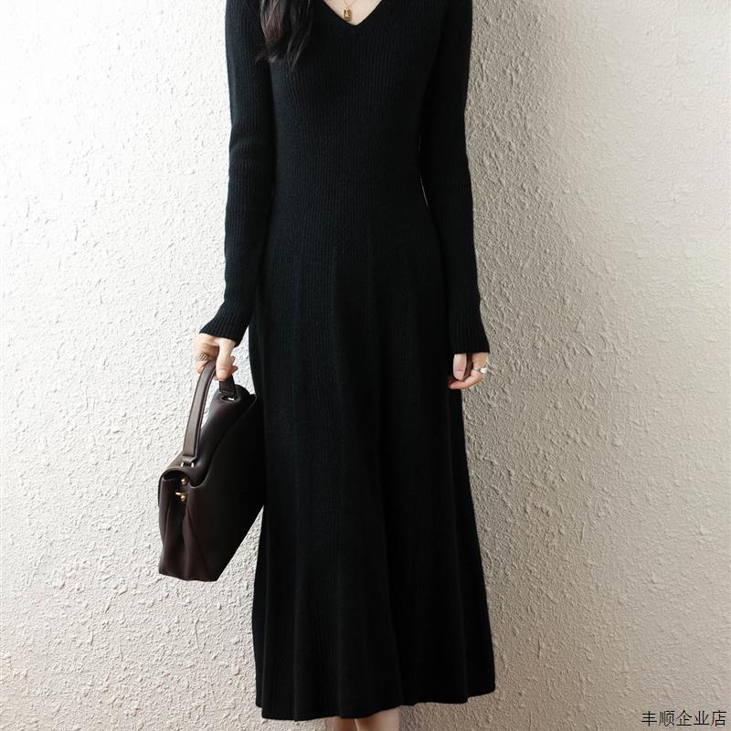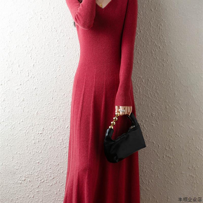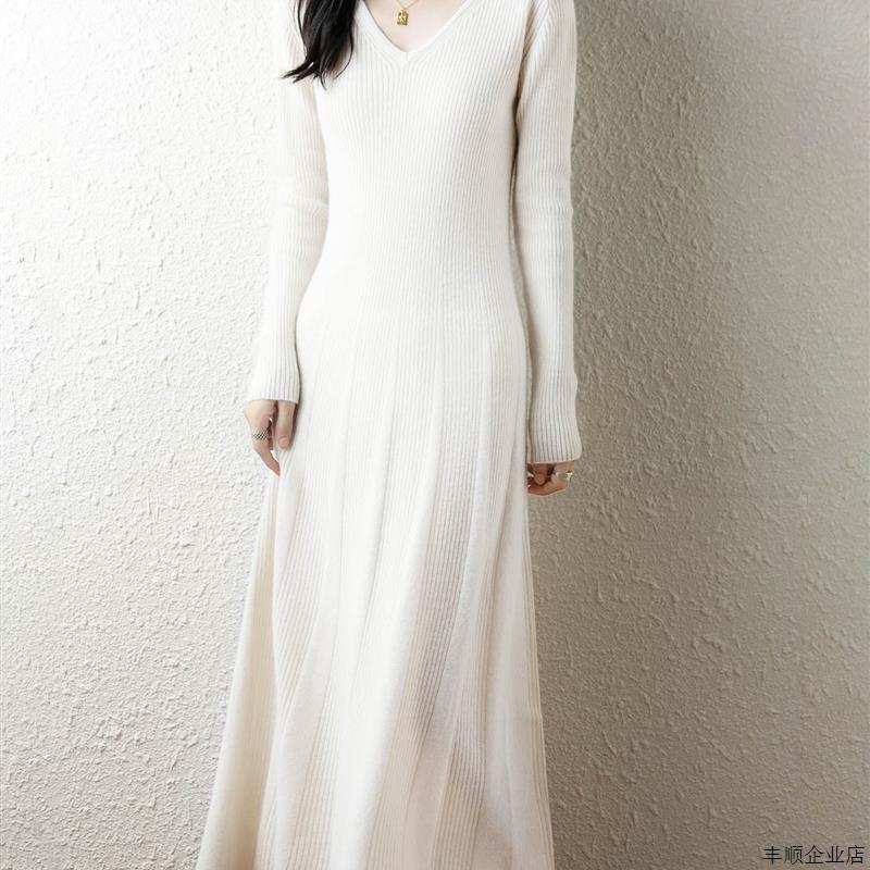 秋冬V领100%纯羊毛针织连衣裙女长款过膝羊绒毛衣裙打底显瘦长裙