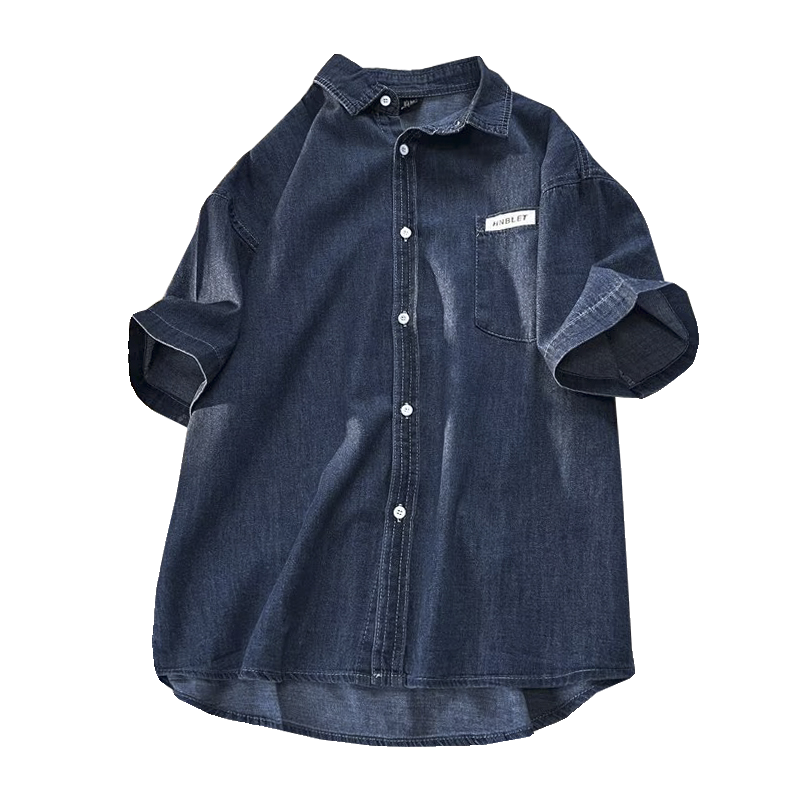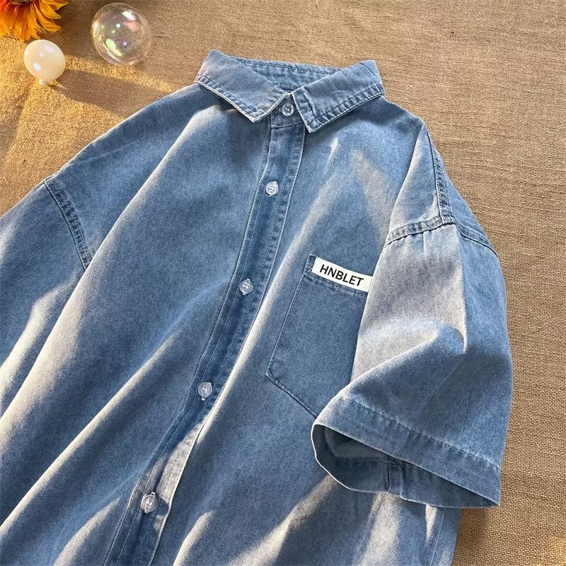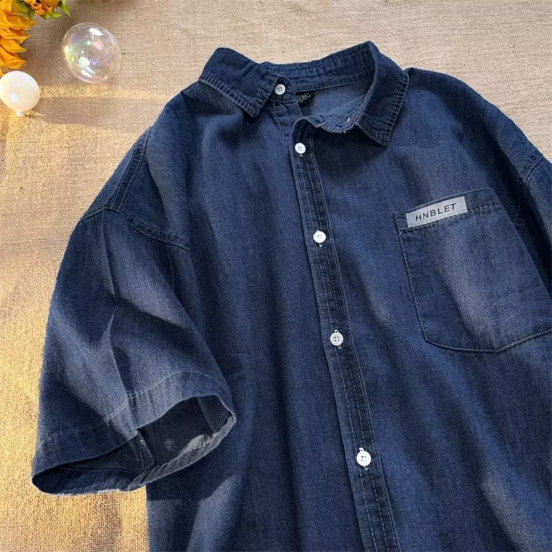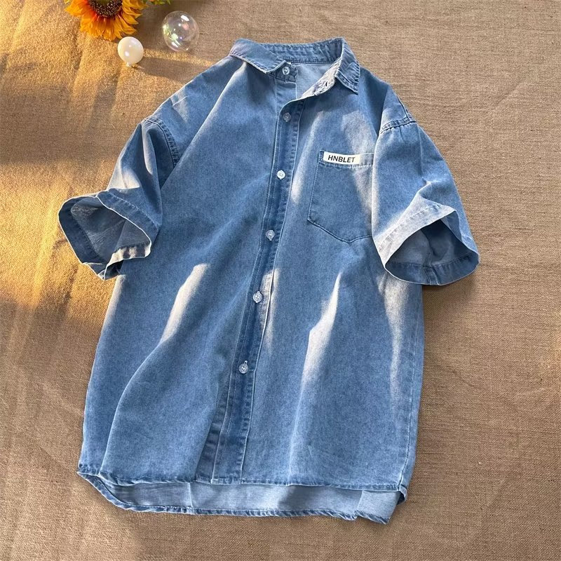 牛仔衬衫男薄款夏季短袖衬衣设计感小众潮牌工装宽松休闲衣服外套