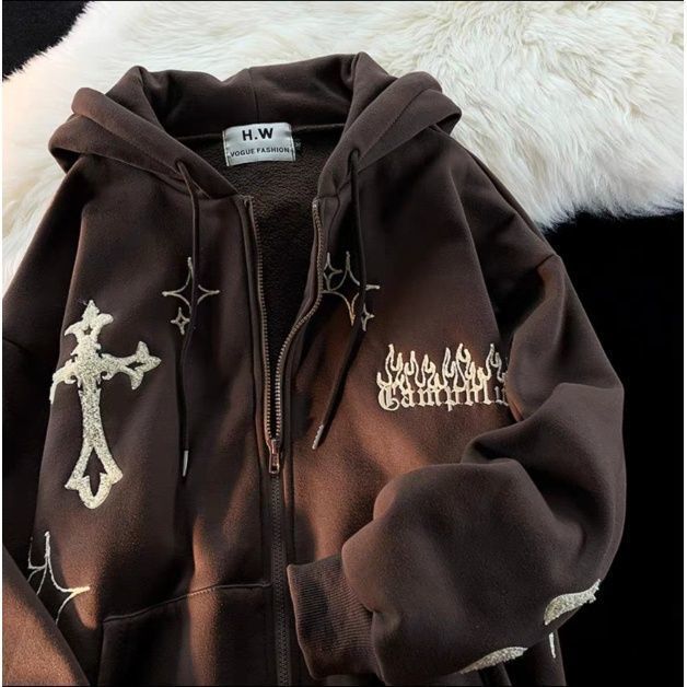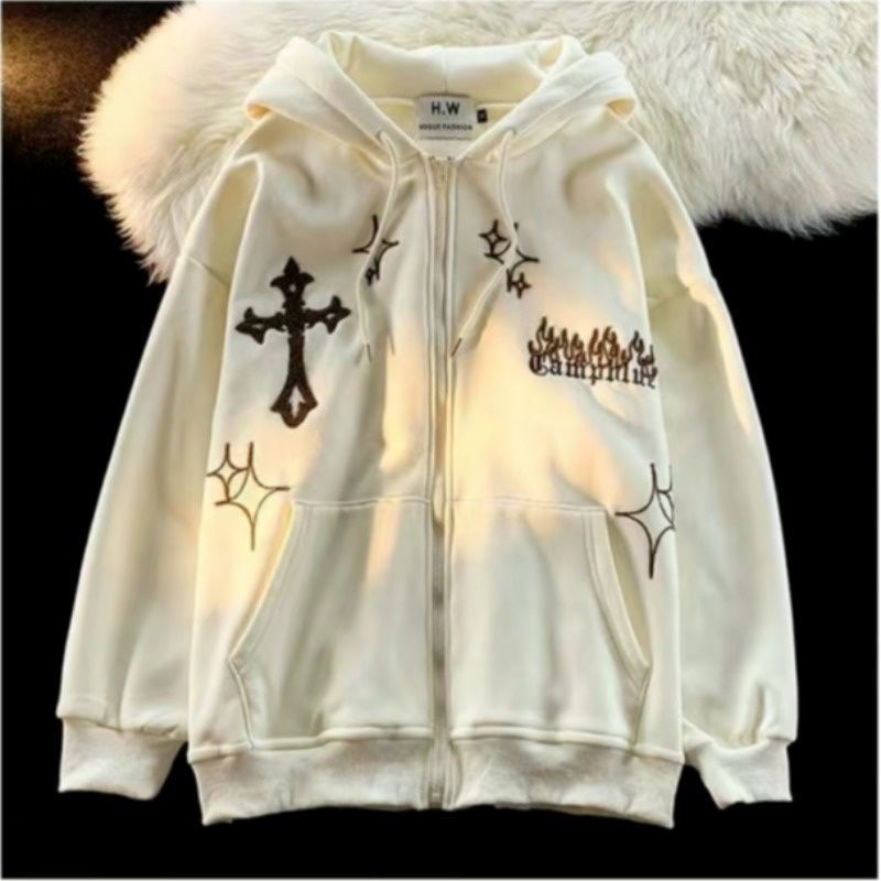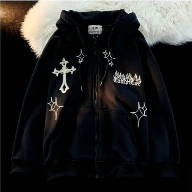 美式复古十字架连帽开衫卫衣男女学生潮oversize情侣宽松外套春秋