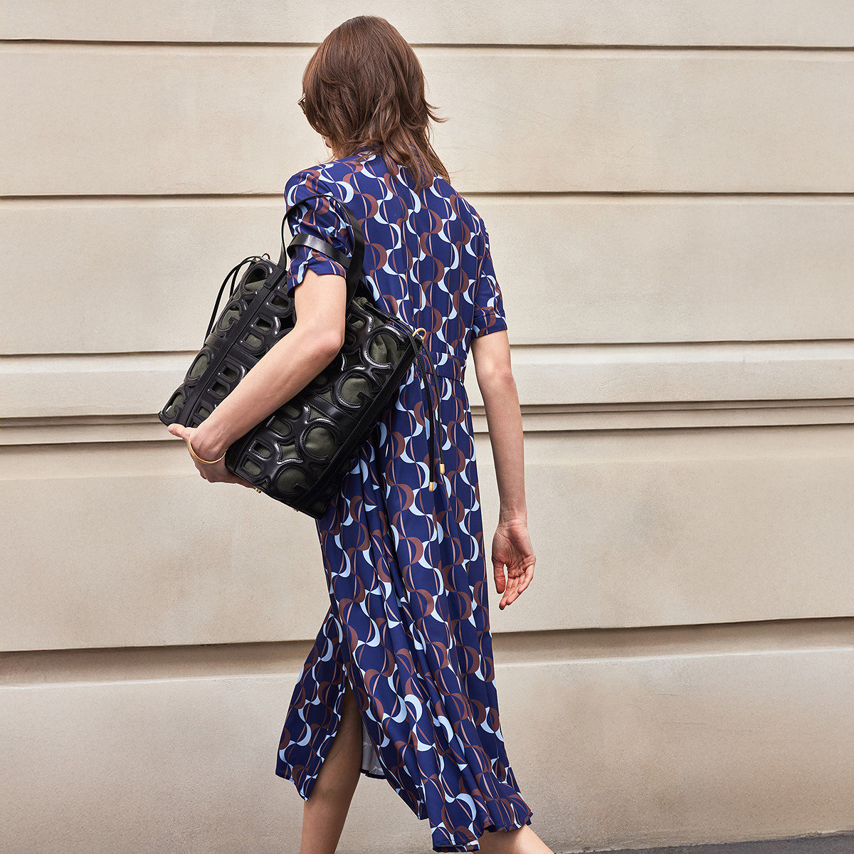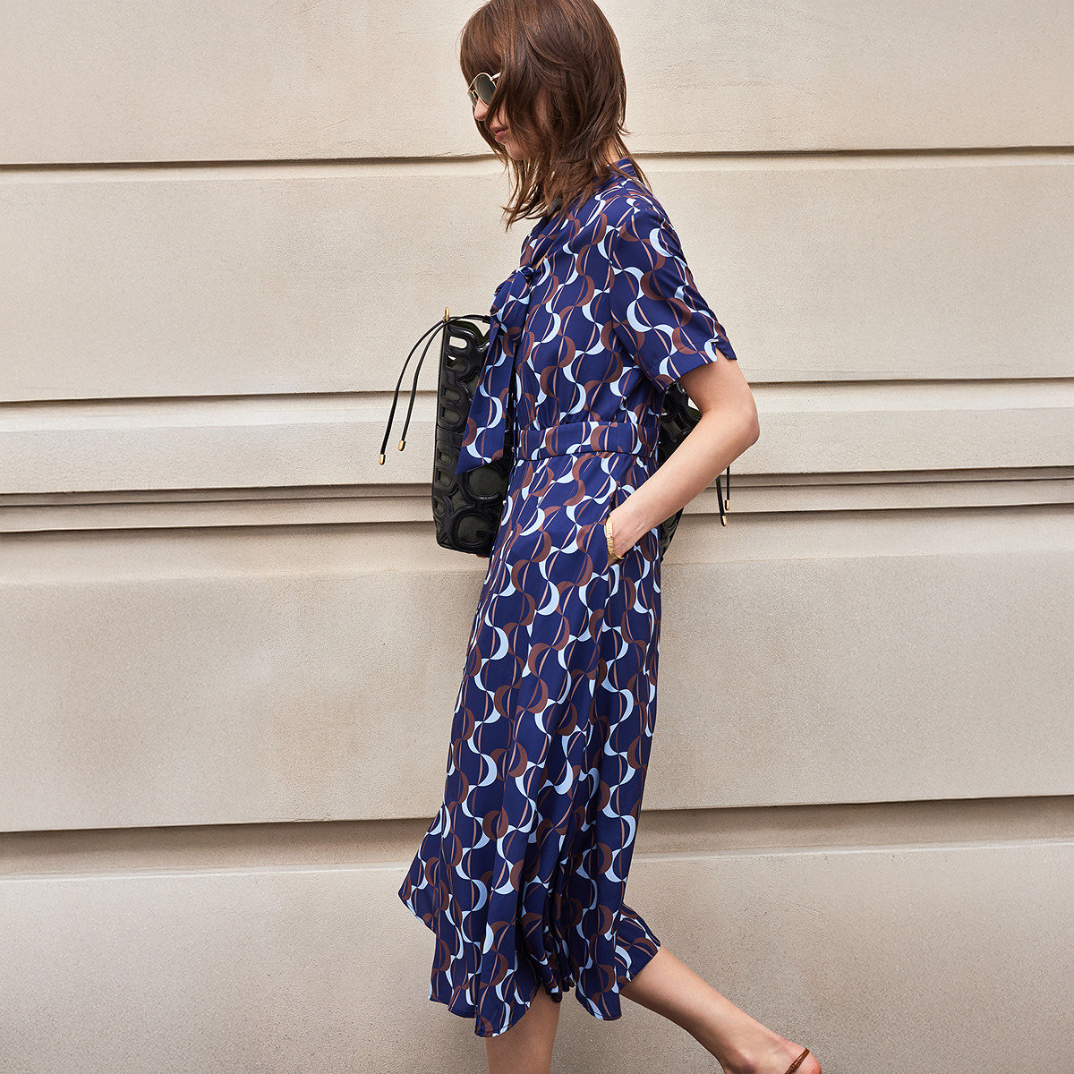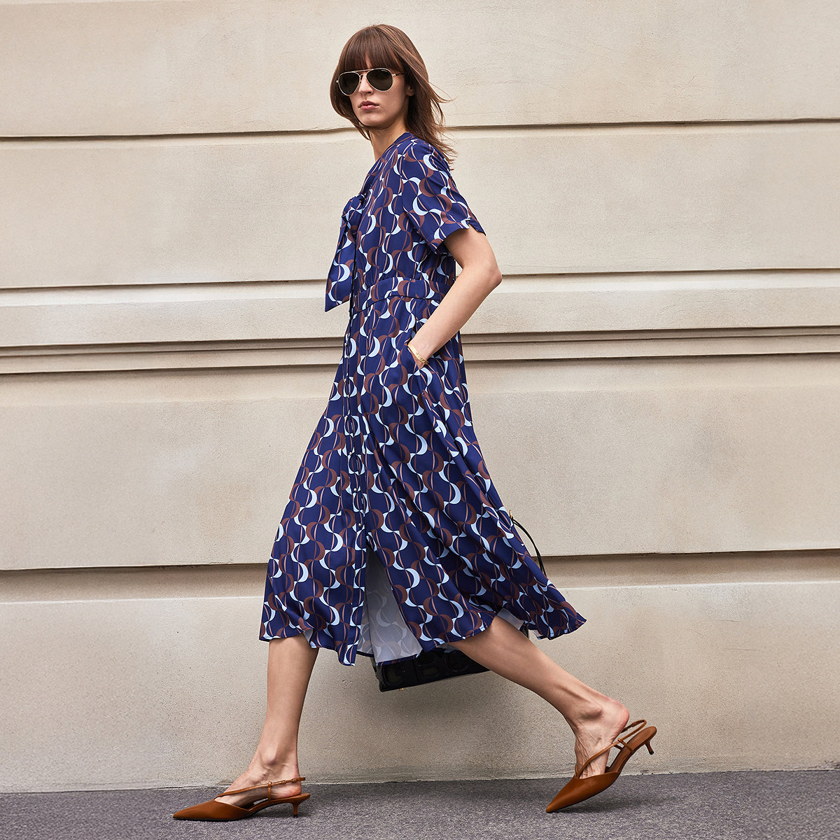 BCBG夏季万千裙装浪中月影法式浪漫月牙波浪印花系带领连衣裙女