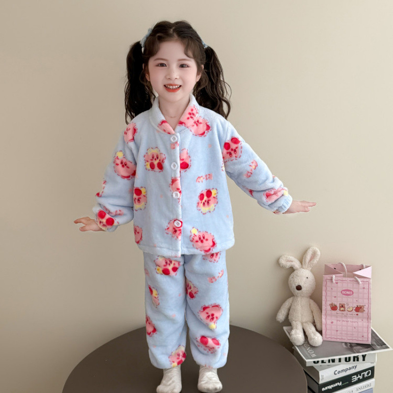 儿童睡衣女孩秋冬季珊瑚绒2025新款开衫立领法兰绒套装女童家居服