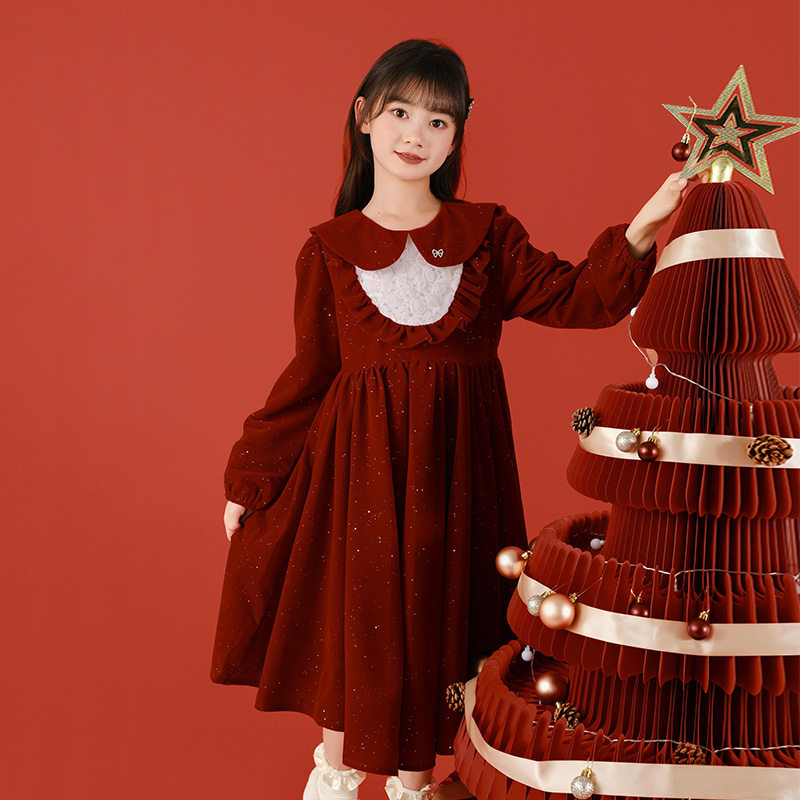 女童亮片丝绒连衣裙儿童2023冬季新款娃娃领洋气裙子红色圣诞礼服