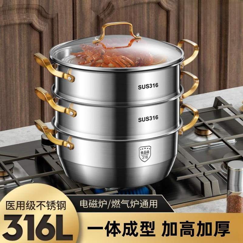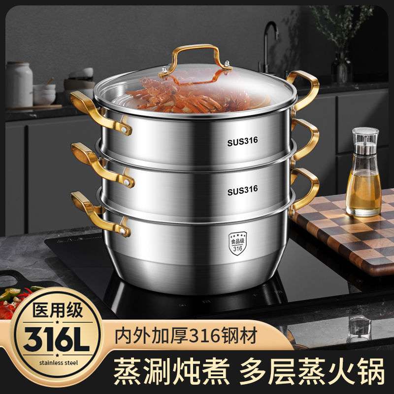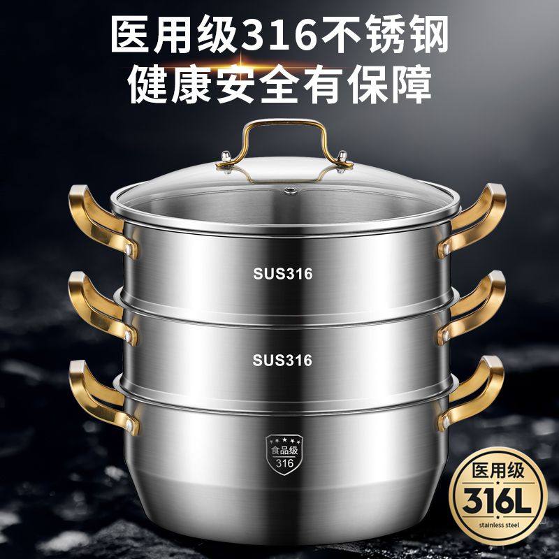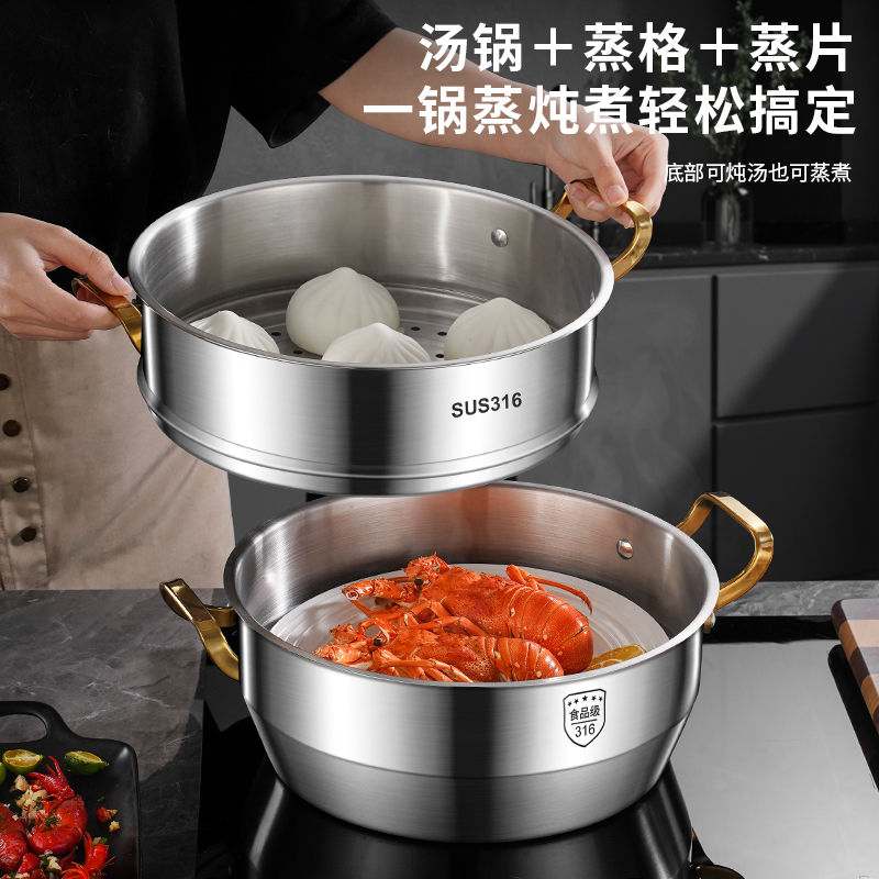 加高特厚316不锈钢蒸锅大号双三四层家用单篦汤锅火锅一体32 34cm