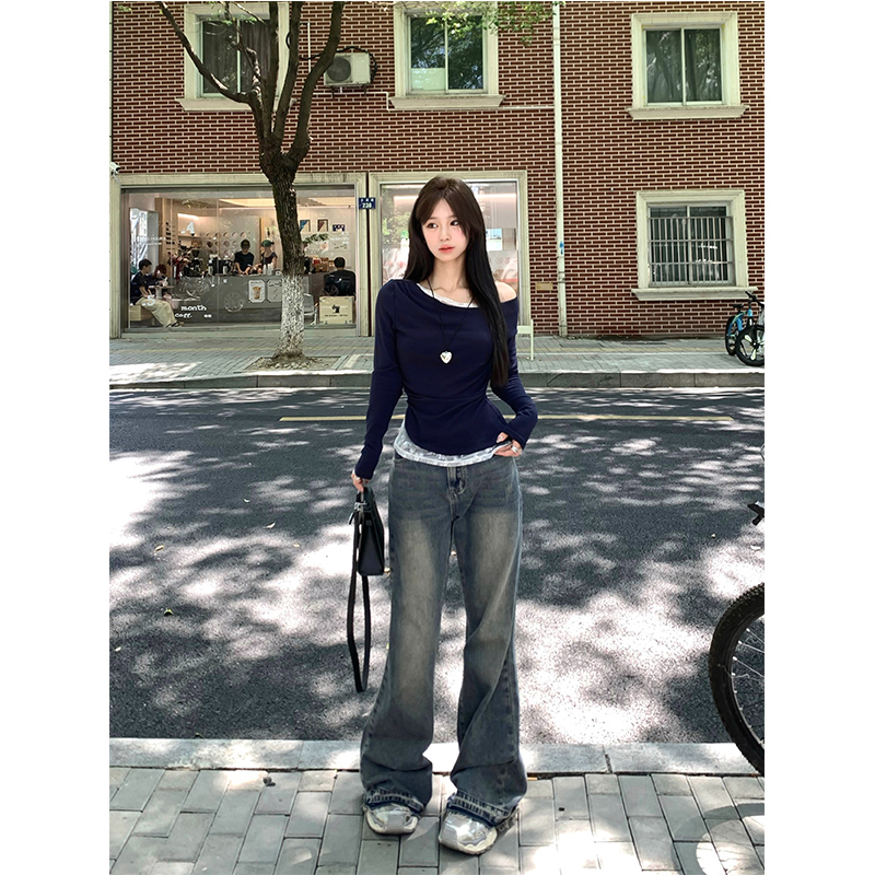 Adan蕾丝斜领露肩假两件上衣韩版收腰显瘦心机设计感长袖T恤女秋