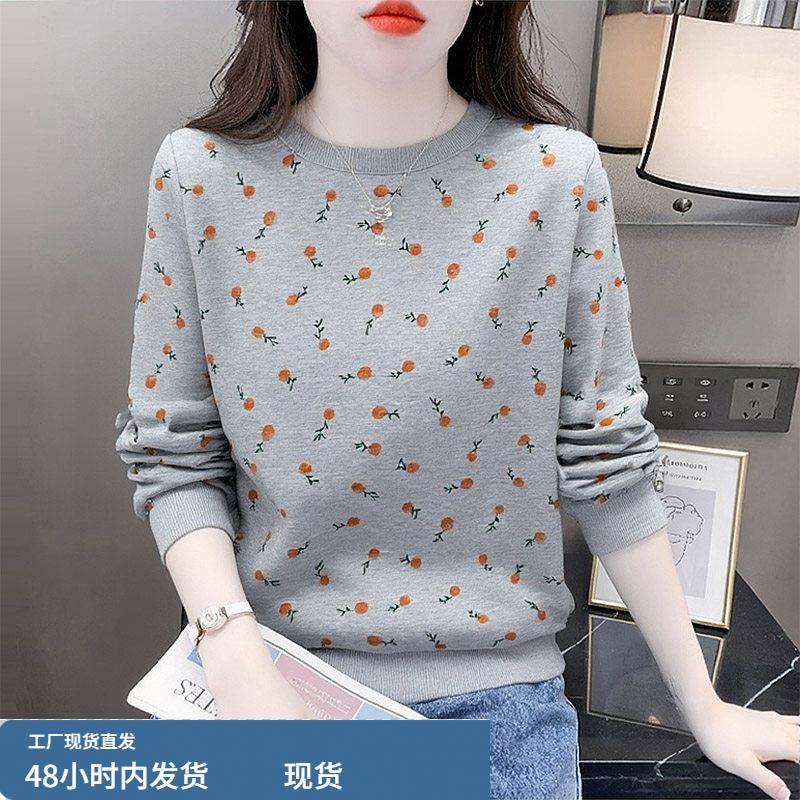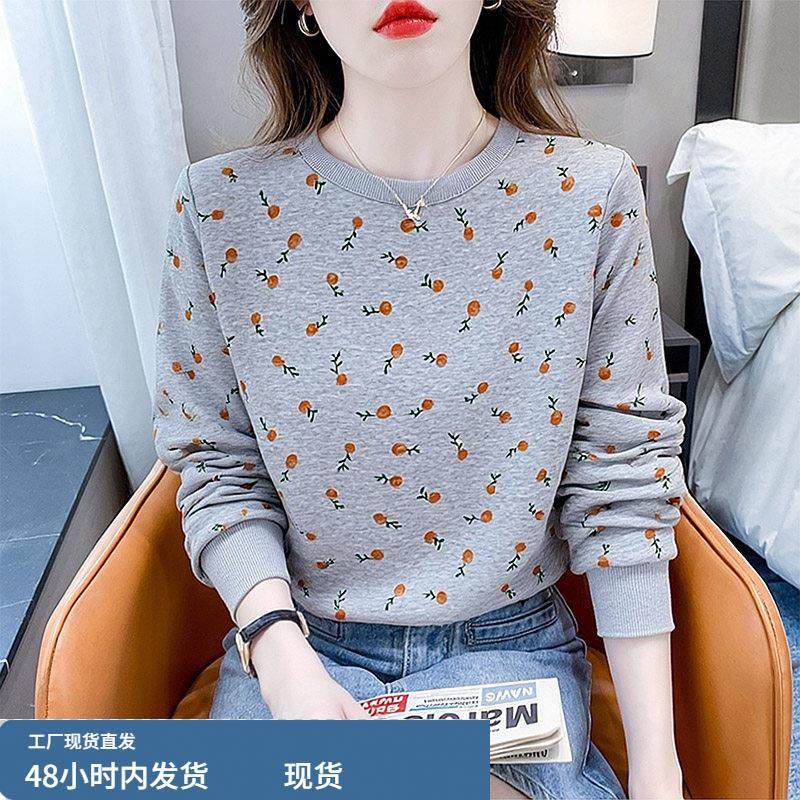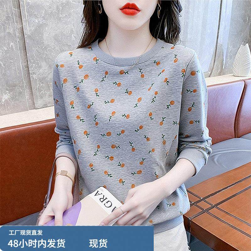 洋气印花纯棉圆领卫衣2025新款T恤女装宽松长袖打底衫女士上衣服