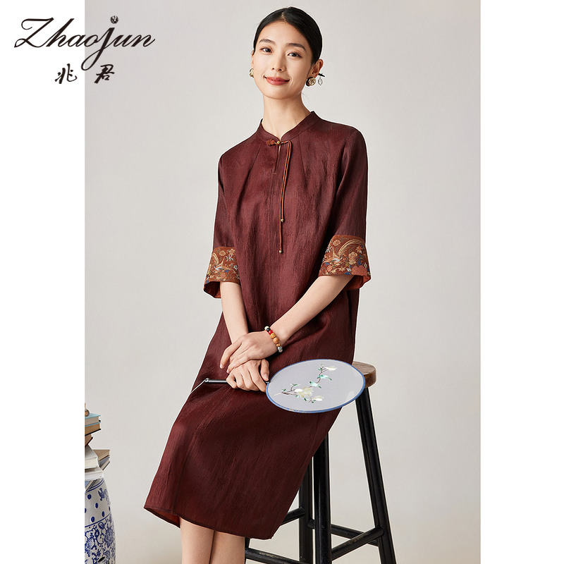 兆君春夏真丝新款中式绣花连衣裙女桑蚕丝红云纱半袖宽松裙子