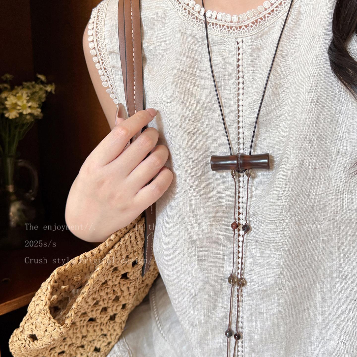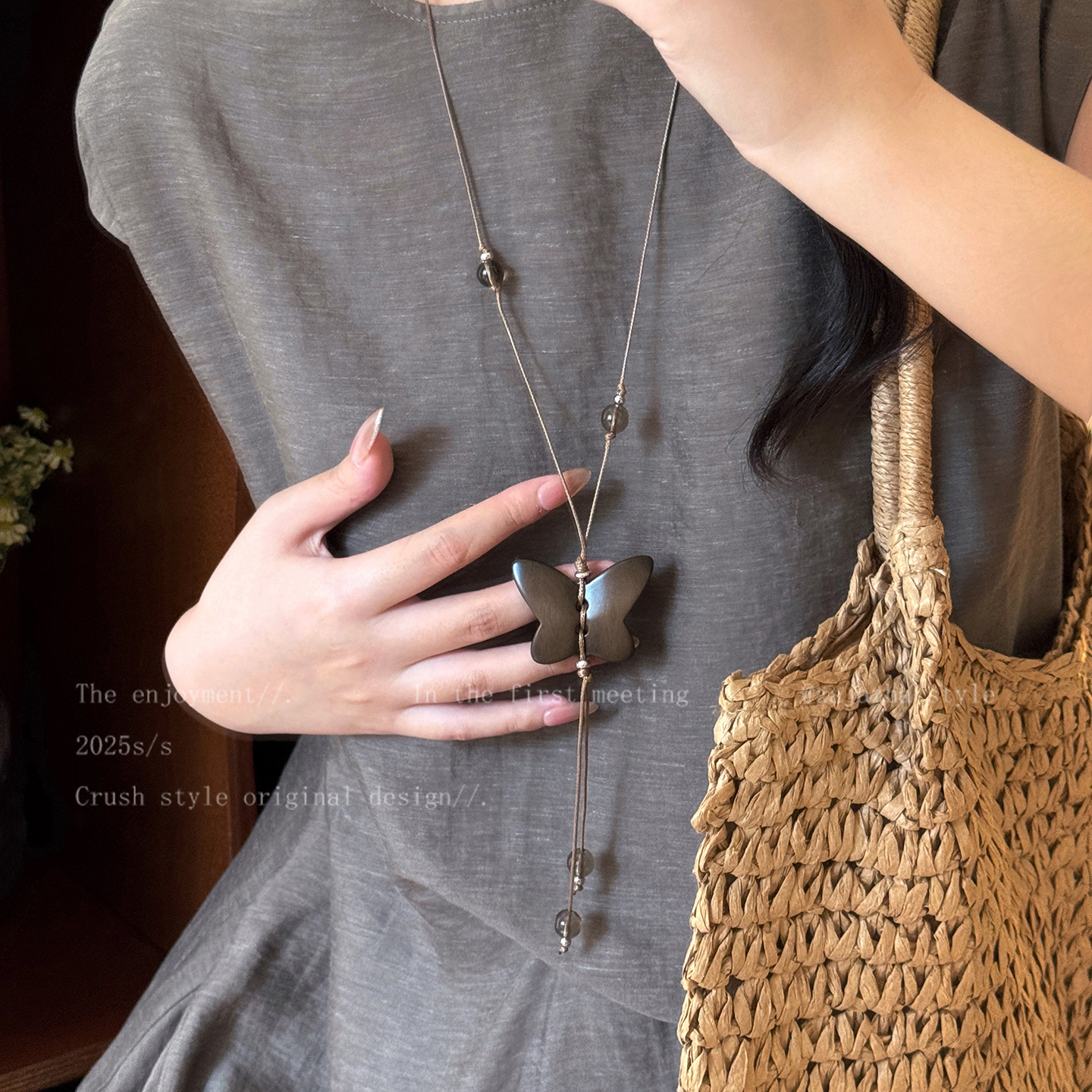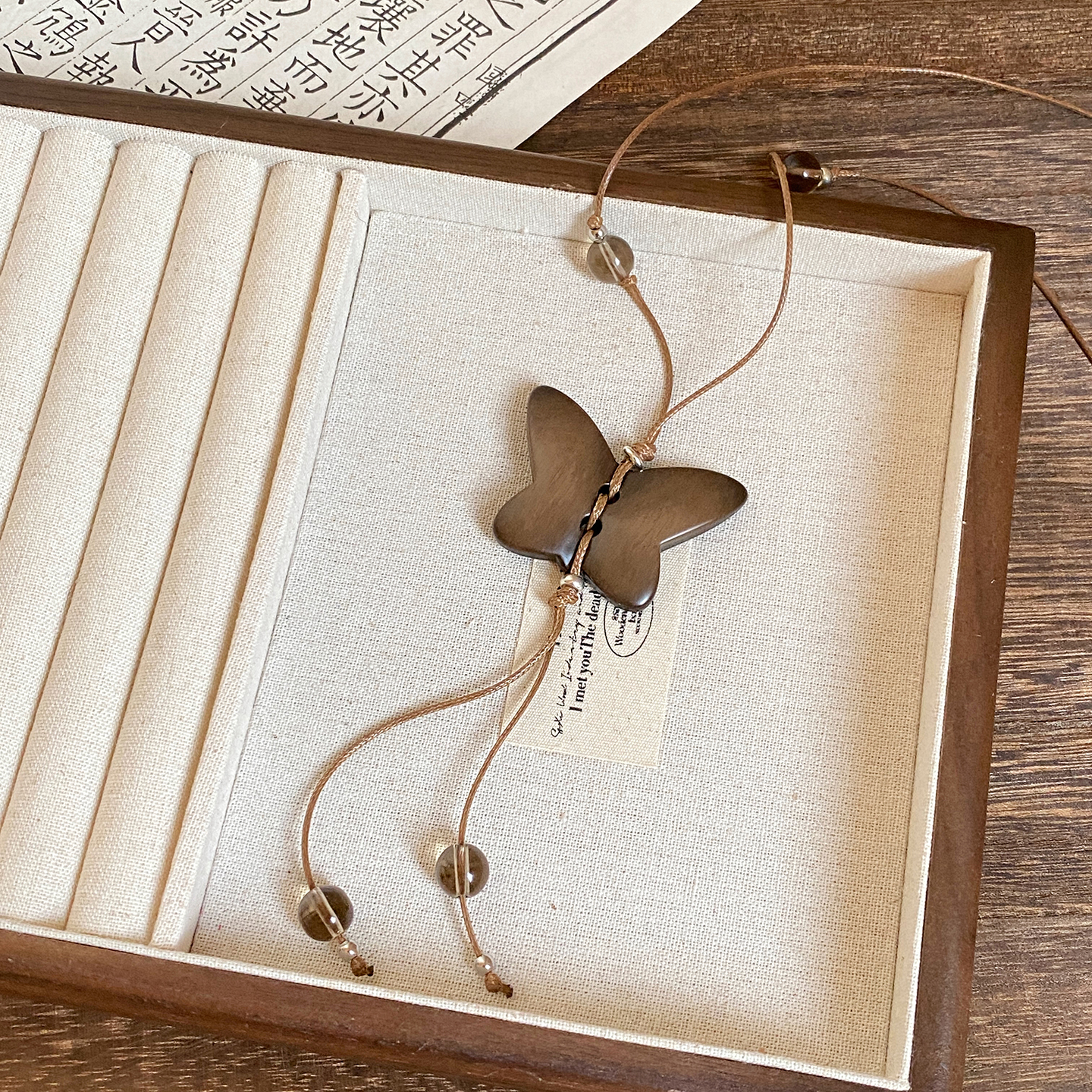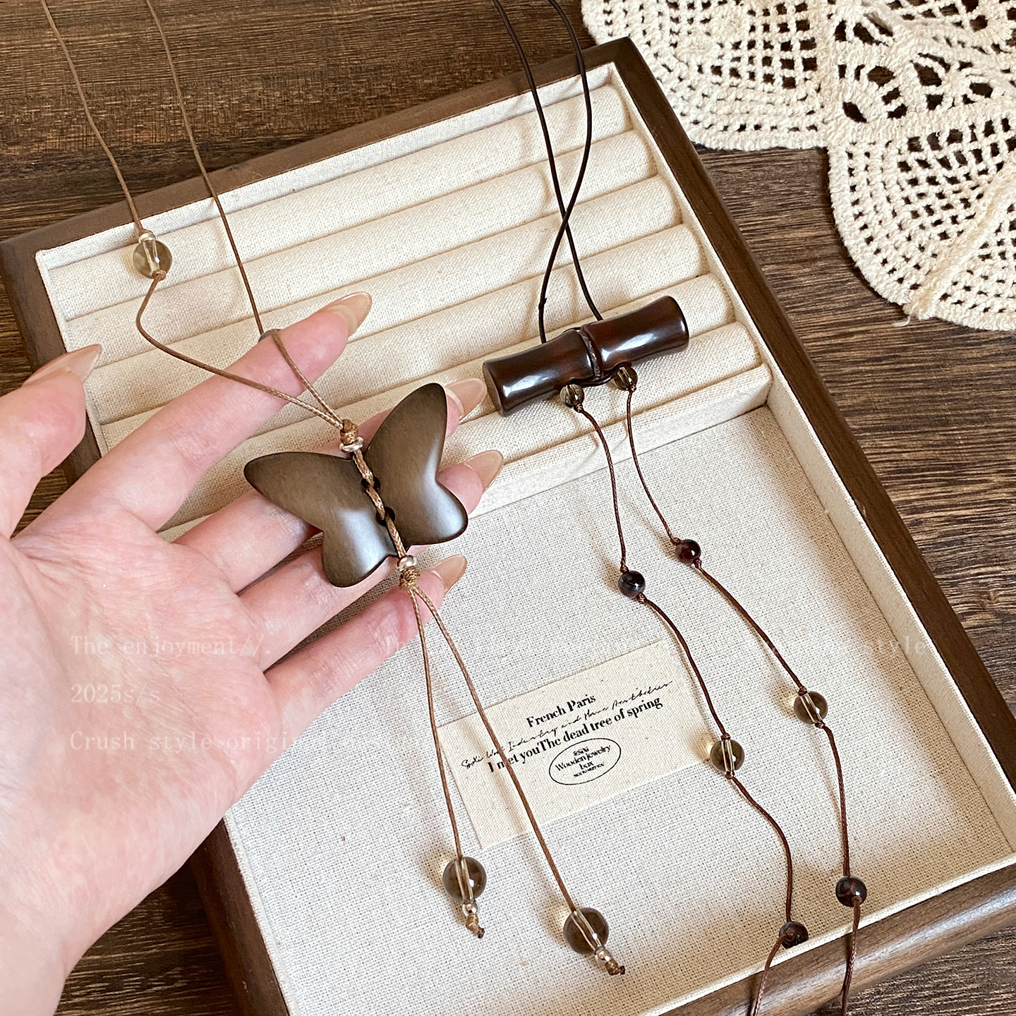 新中式复古木质蝴蝶项链女民族风小众长款挂脖毛衣链抽拉调节配饰