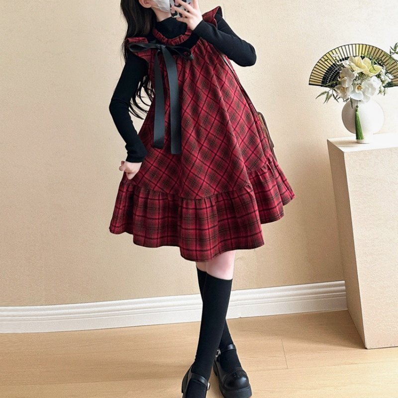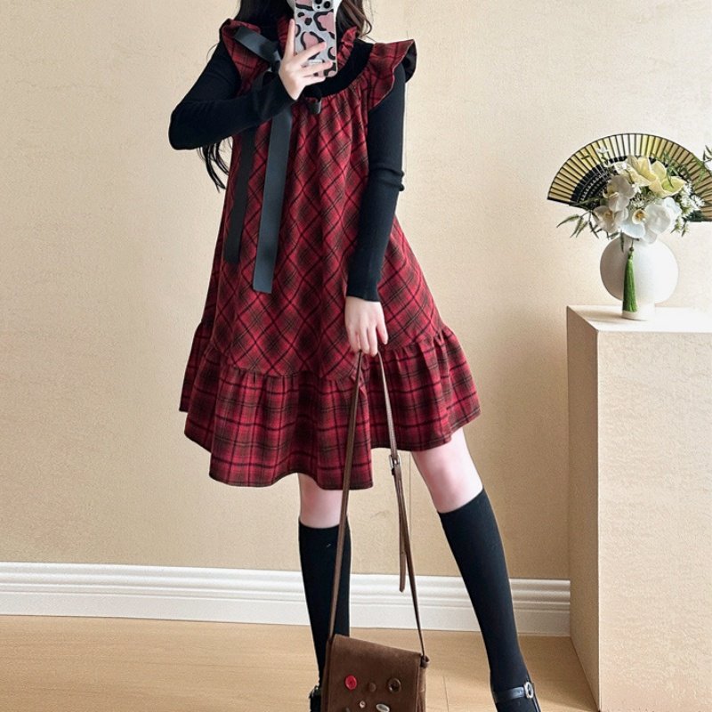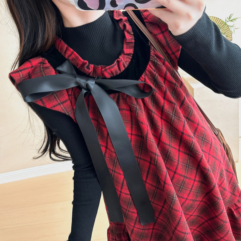 胖女童格子连衣裙秋款加肥加大码中大童胖女孩蝴蝶结甜美无袖裙子