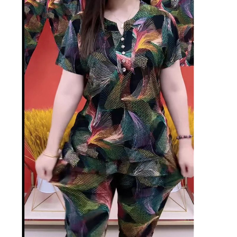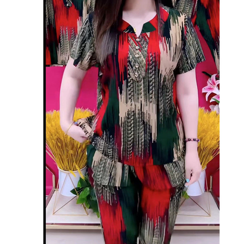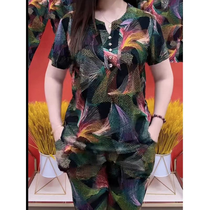妈妈夏季套装中老年人女装夏天牛奶丝冰丝清凉短袖t恤+裤子两件套
