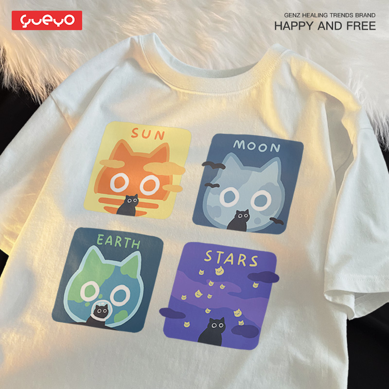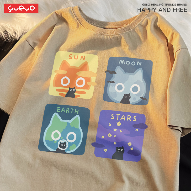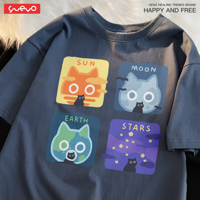 悦游 天文猫三连 夏季宽松短袖T恤男日系潮牌男纯棉太阳月亮地球