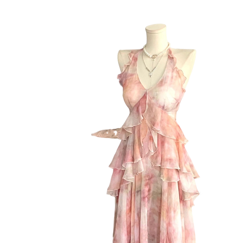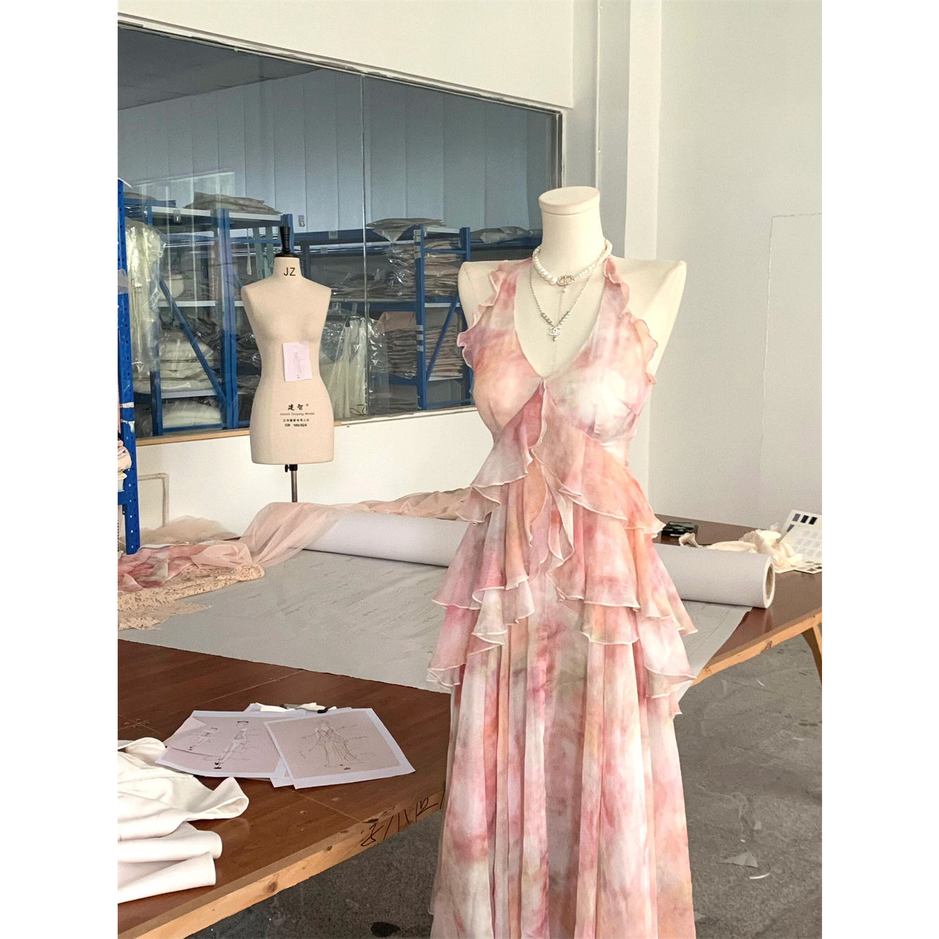 法式气质油画印花吊带连衣裙女夏季新款度假风不规则荷叶边长裙子