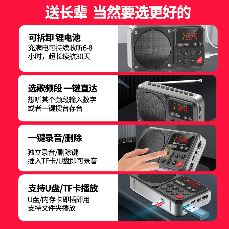 金正多功能蓝牙收音机老人专用定时播放器可插卡音响便携式录音机