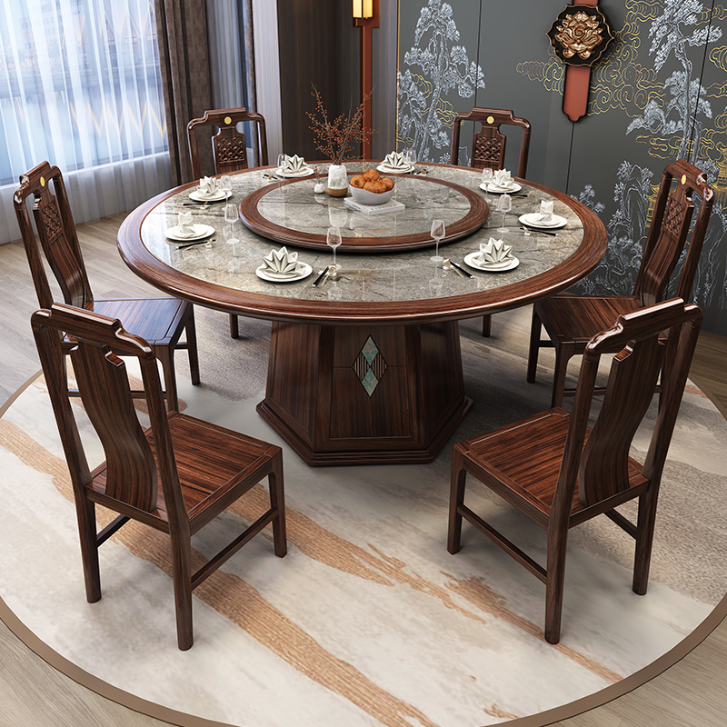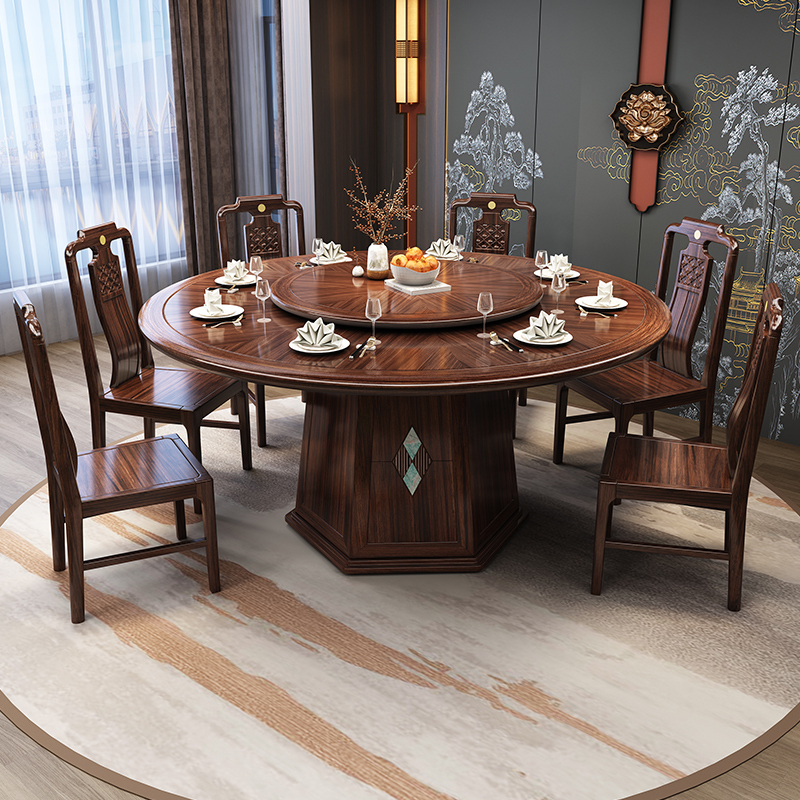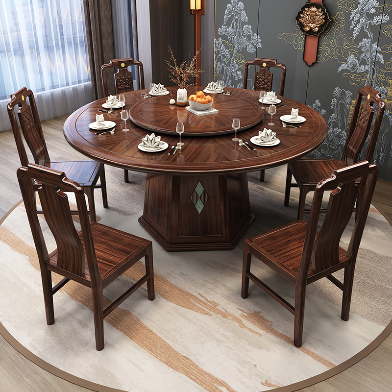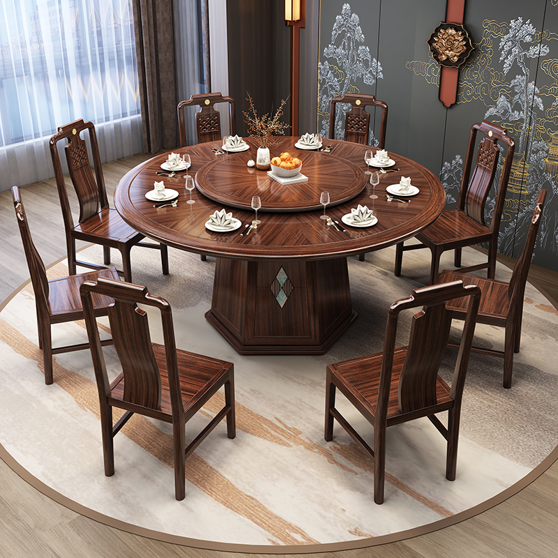 新中式乌金木实木餐桌椅组合家用圆形饭桌带转盘10人吃饭桌子圆桌